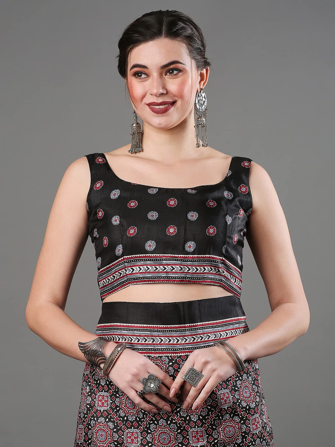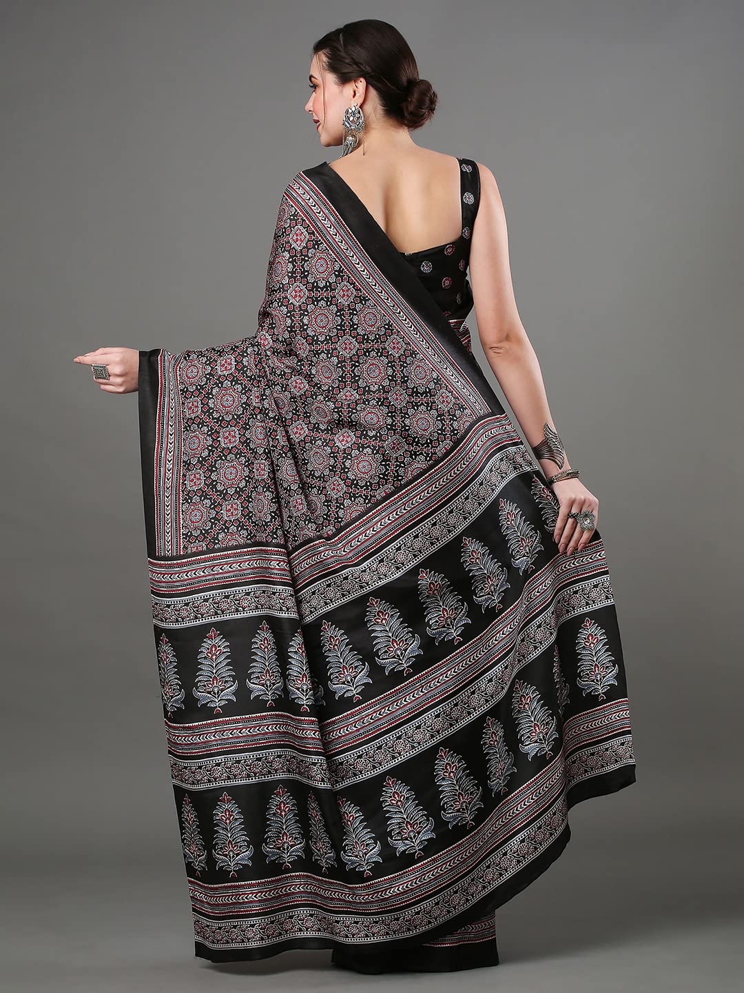 SAREE MALL Women’s Ajrak Block Print Dola Silk Saree With Unstitched Blouse Piece