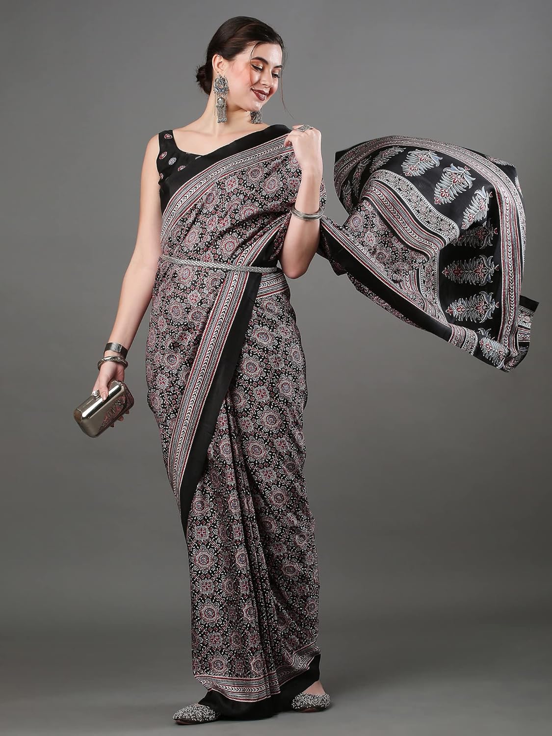 8 reviews for SAREE MALL Women’s Ajrak Block Print Dola Silk Saree With Unstitched Blouse Piece