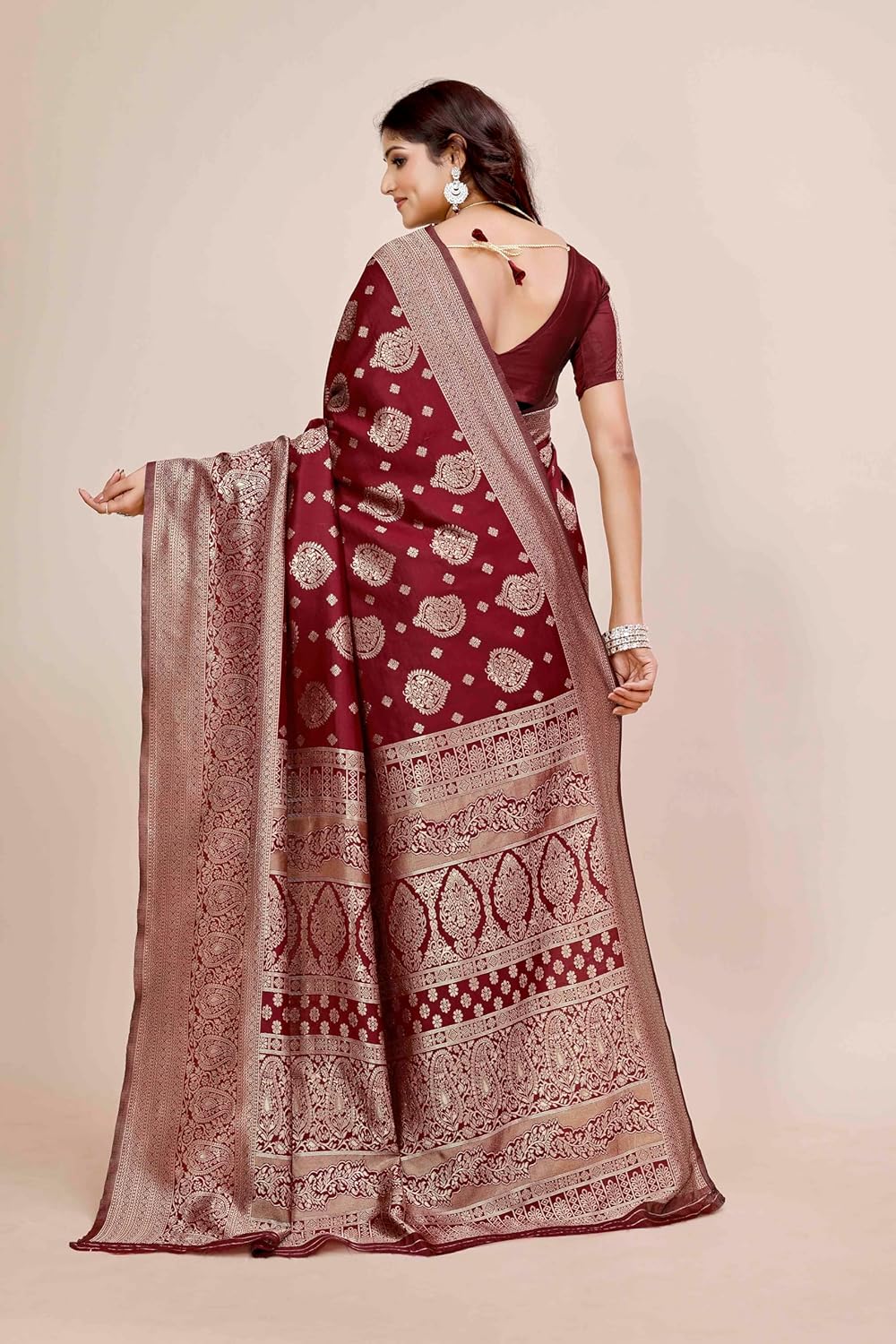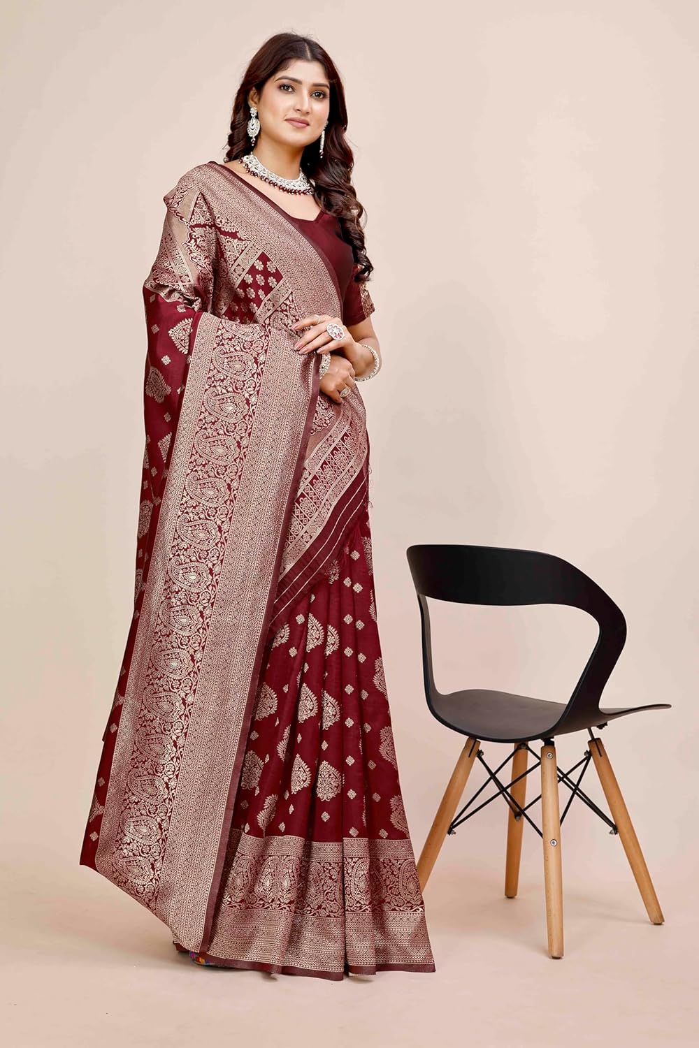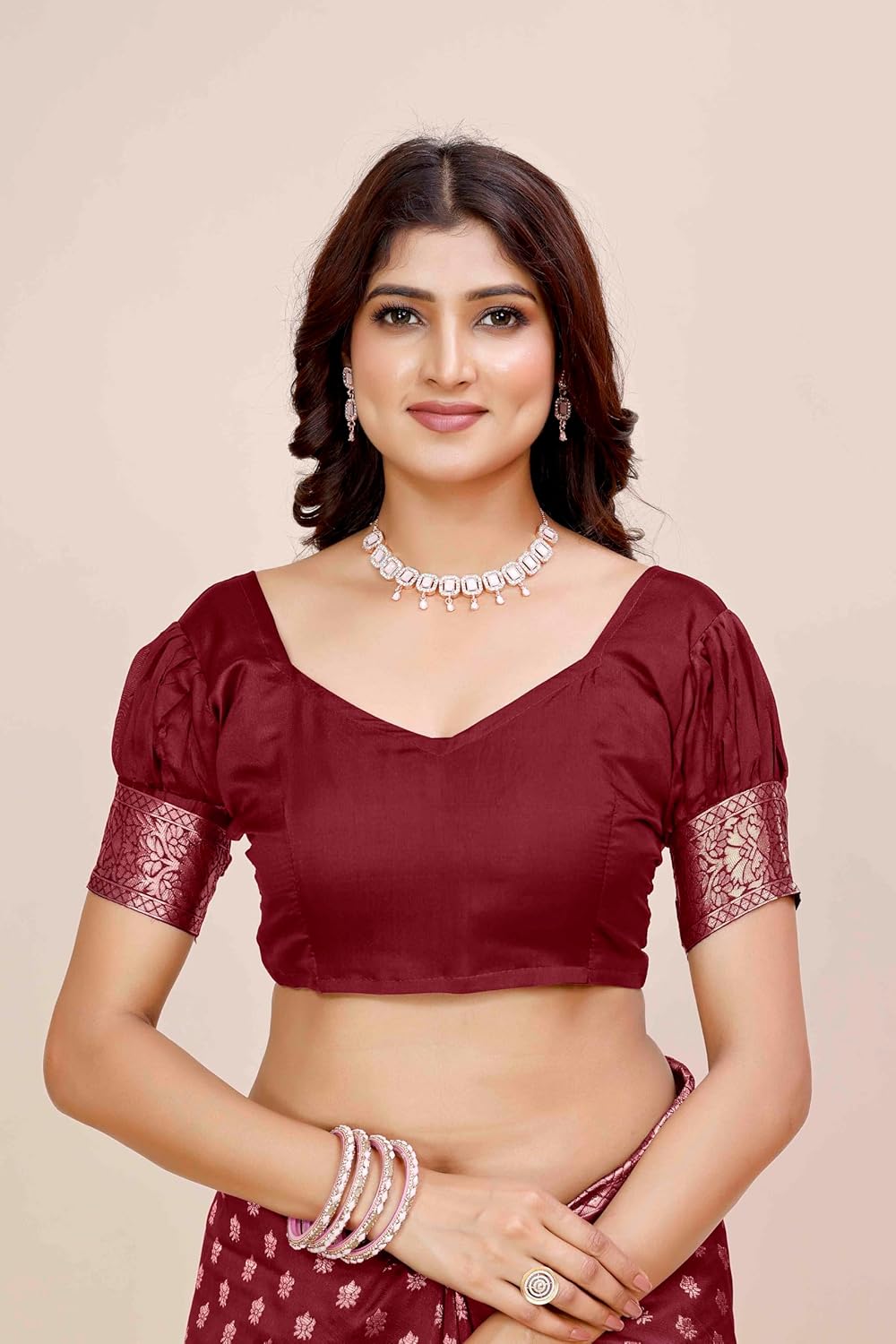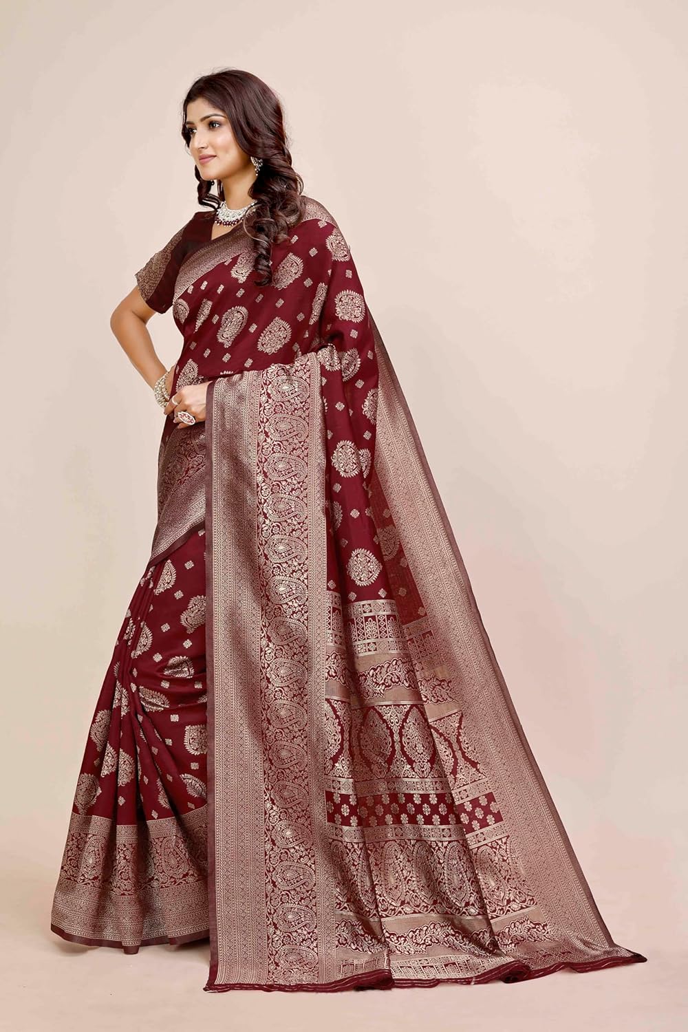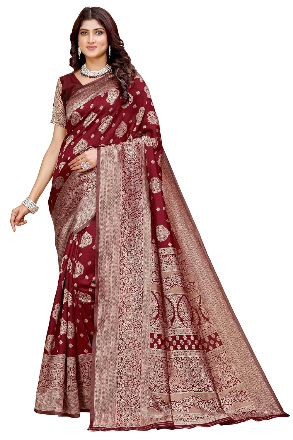 From long time searching for good banarsi saree look so I came across with this shamsi saree which look royal and very good in material also in this price range, the color is also good suited very well on me.