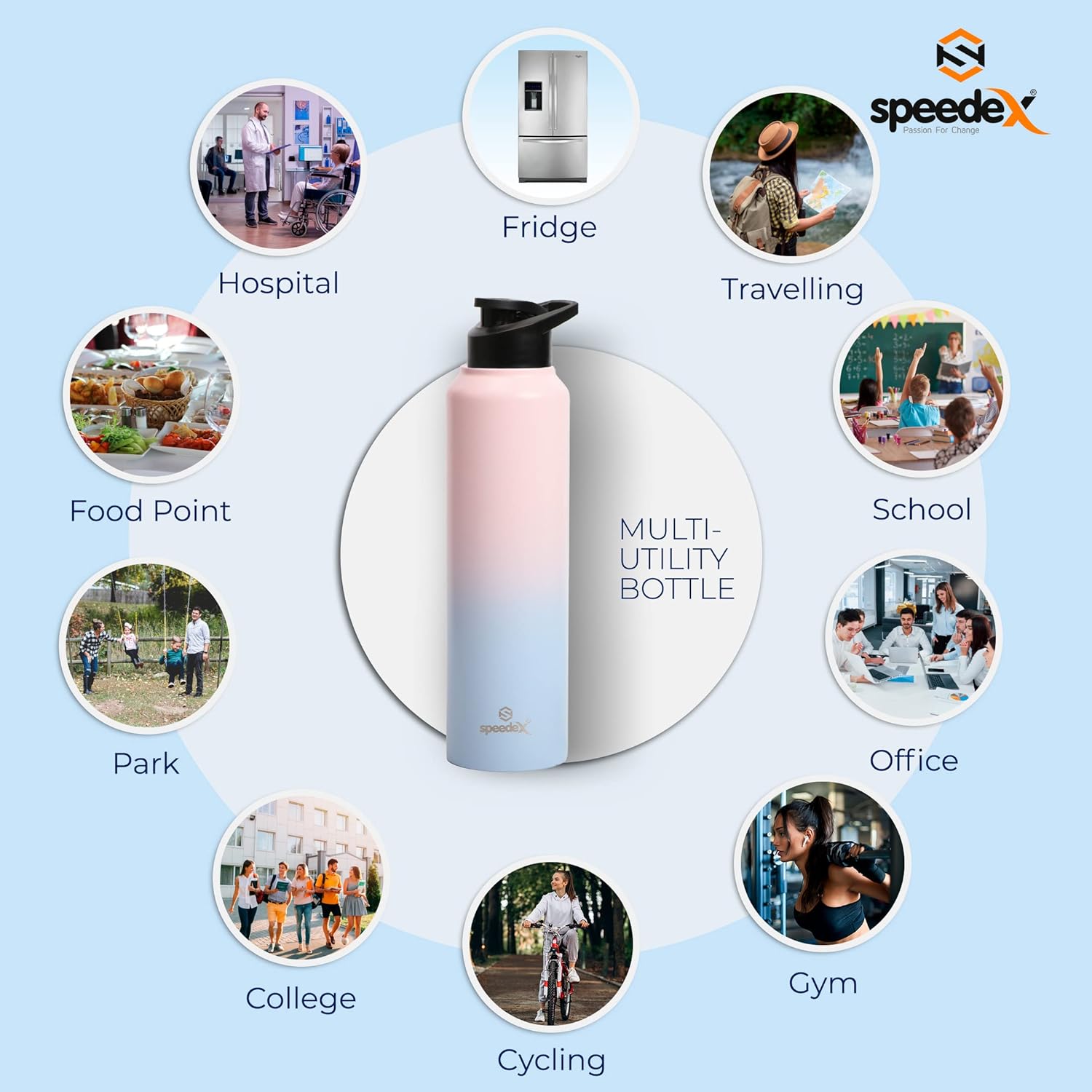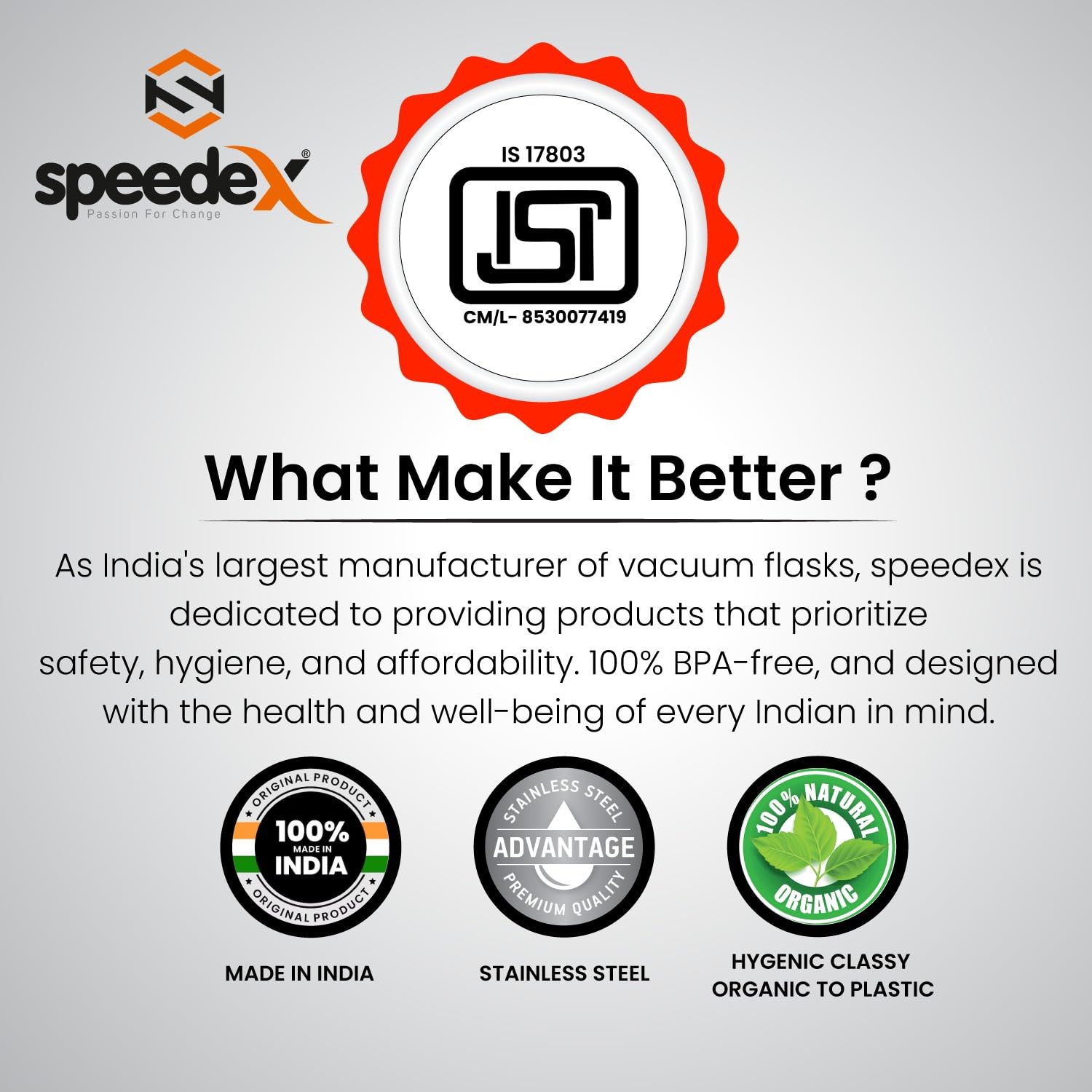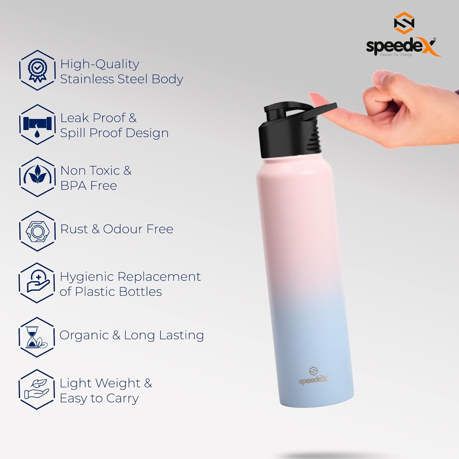 Bought this Speedex stainless steel water bottle for office use, and I’m genuinely happy with the purchase. It has a sleek, professional look that fits right in on my desk. The build quality feels solid, and the stainless steel body keeps the water cool for hours, which is a huge plus during long meetings or summer days.What really stood out for me is the leak proof design. I carry it in my laptop bag sometimes, and not a single drop has leaked so far. It’s also easy to clean and doesn’t retain any odour, which was a concern I had with other bottles in the past.