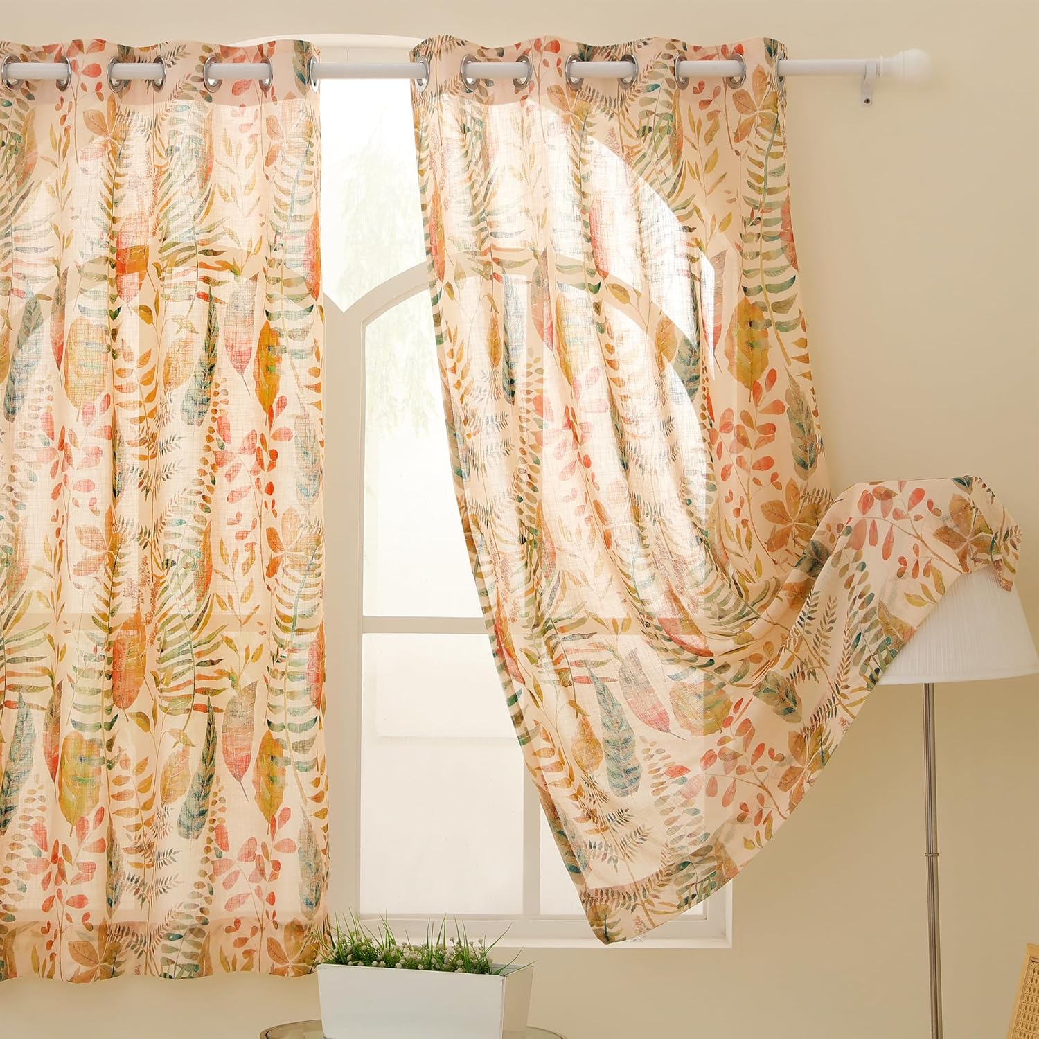 Story@Home Window Curtains 5 Feet Long Set of 1 | Leaf Printed | Semi Transparent Curtain | Net Curtains | Sheer Curtain for Living Room | (118 X 152 Cm, Cream & Orange) | Perfect for Home Decor