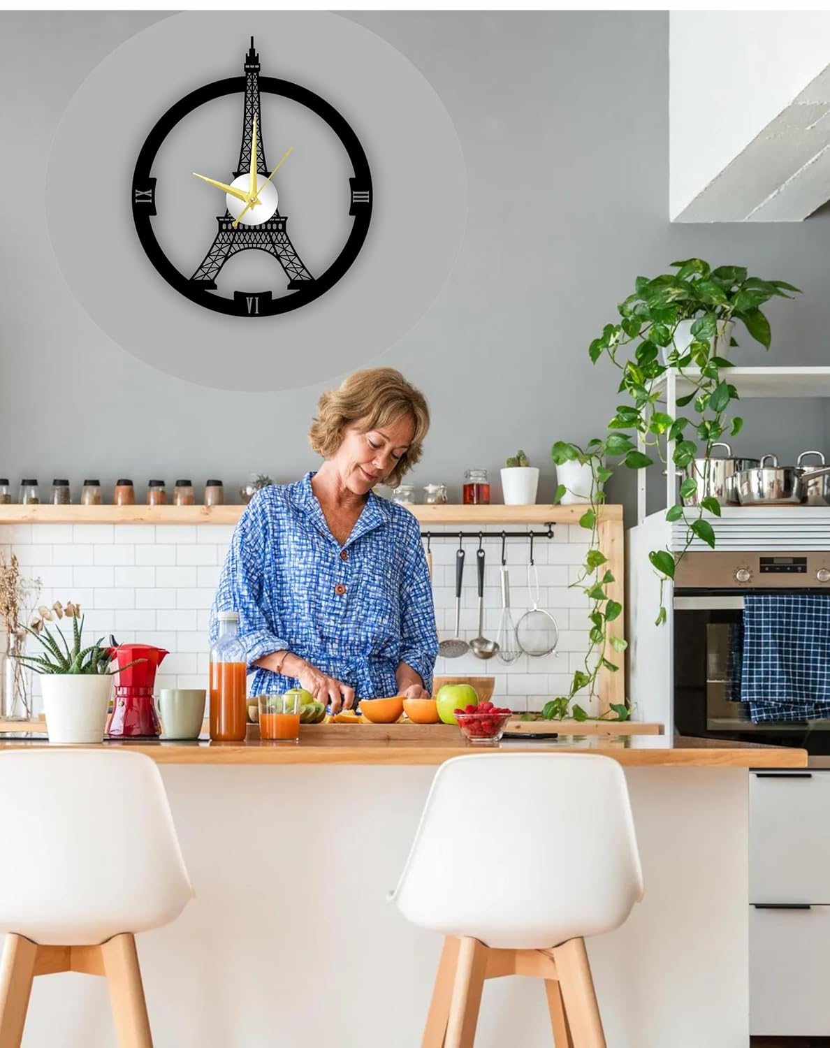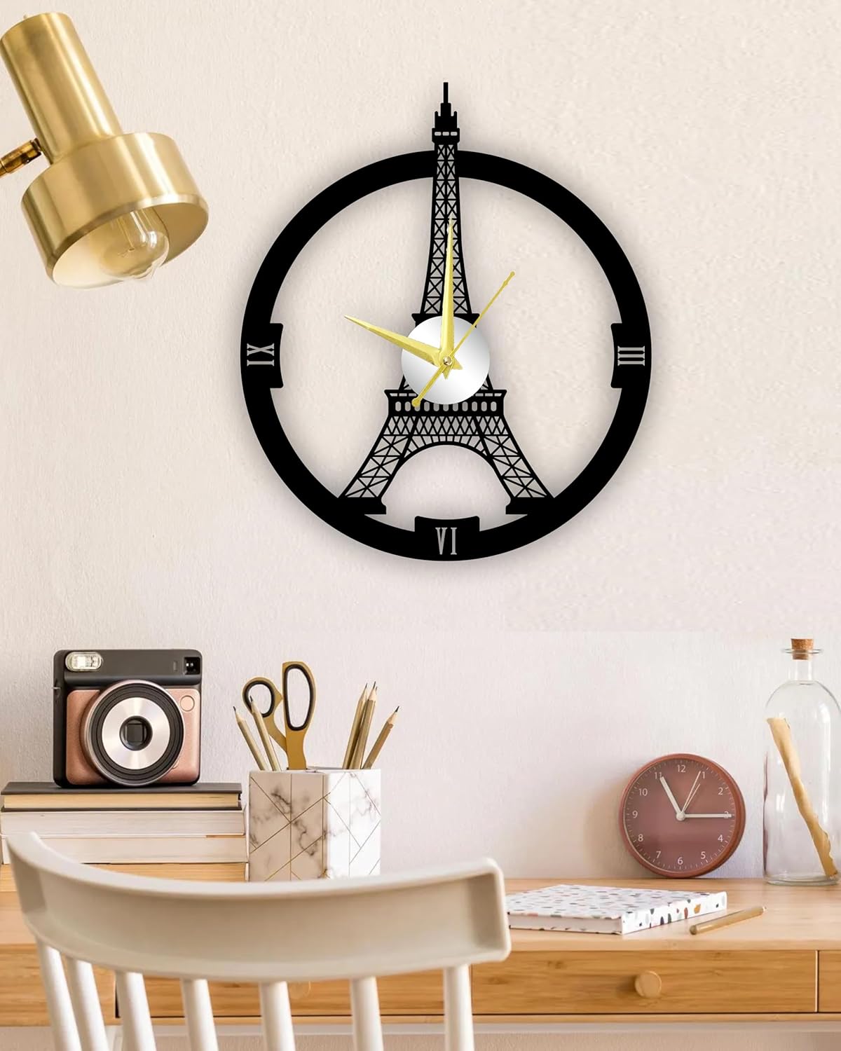 This wall clock looks exactly as shown in the pictures. The metal finishing is excellent and the Eiffel design gives a modern and stylish look to the wall. The clock is lightweight but strong and the golden hands make