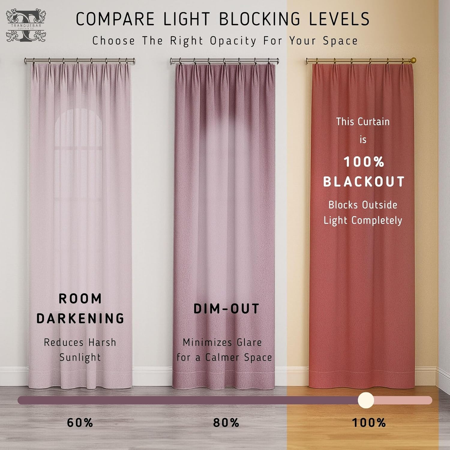 These curtains seriously surprised me. The blackout is really BLACK OUT — not even a tiny bit of light comes in, and my bedroom now feels like its night whenever I close the curtains :). It gets very bright afternoon sun, so the curtains have made a lot of difference. Also, the fabric looks really nice — its actually thick cotton in front!!! I was expecting something synthetic, like my other set of blackout curtains, but this very elegant. I wasn’t expecting them to look this nice. Very happy with the purchase.