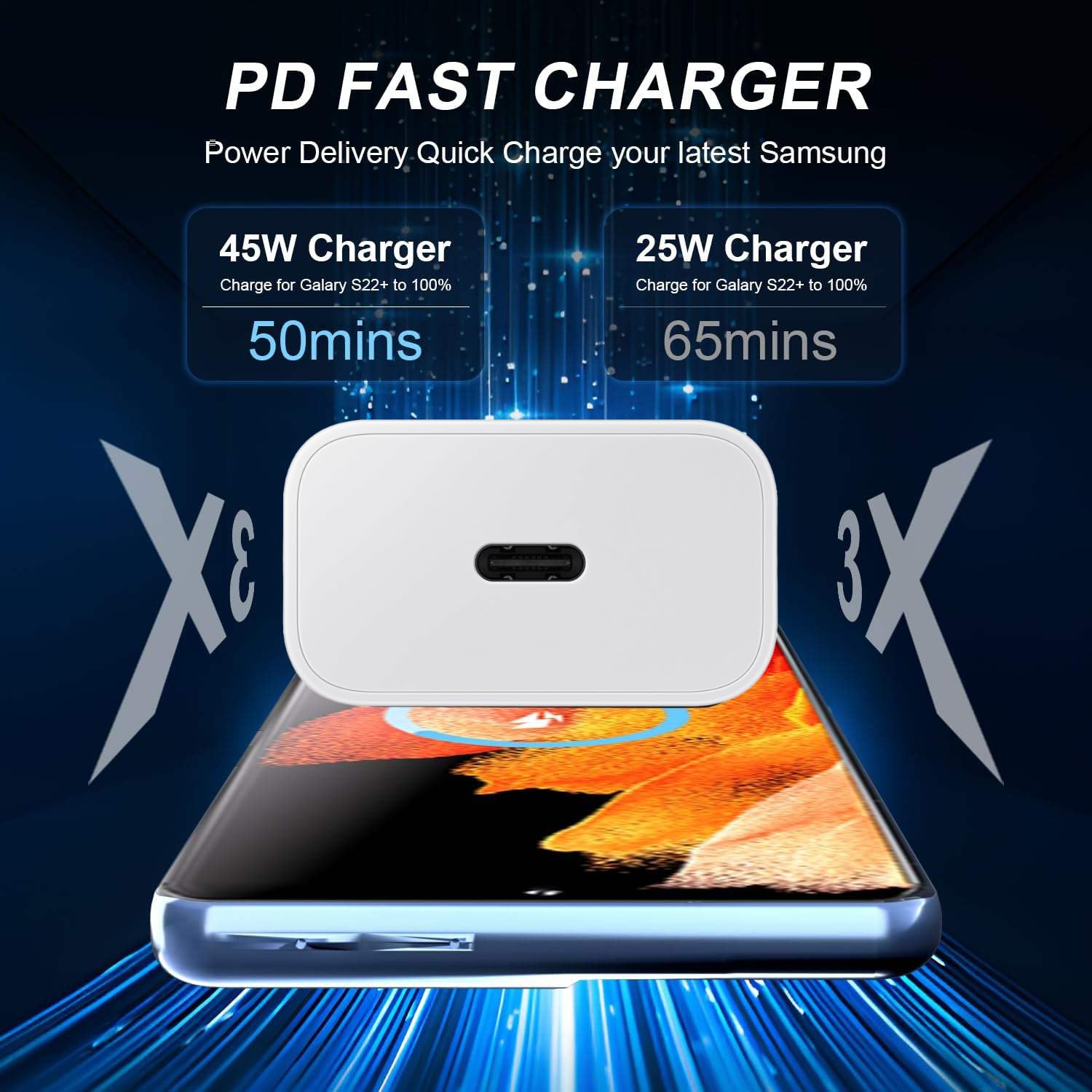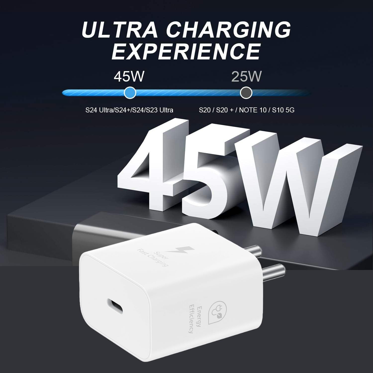 𝐖𝐢𝐝𝐞 𝐂𝐨𝐦𝐩𝐚𝐭𝐢𝐛𝐢𝐥𝐢𝐭𝐲: 45W charger is designed for broad compatibility, Compatible with Samsung Galaxy S23, S23 Ultra, S23+, S22, S22+, S22 Ultra, Note 10+, Note 10+ 5G, A91, and future devices. It also offers super-fast charging up to 25W Compatible for Samsung Galaxy S21, S21 Ultra, S21+ 5G, S20, S20 Ultra, S20+, S20 FE, Note 10, Note 10 5G, Note 20, Note 20 Ultra 5G, S10 5G, Galaxy Z Fold 3 5G, A90 5G, A80, A70, Book S, and Tab S7/S7+/S8/S8+/S8 Ultra.