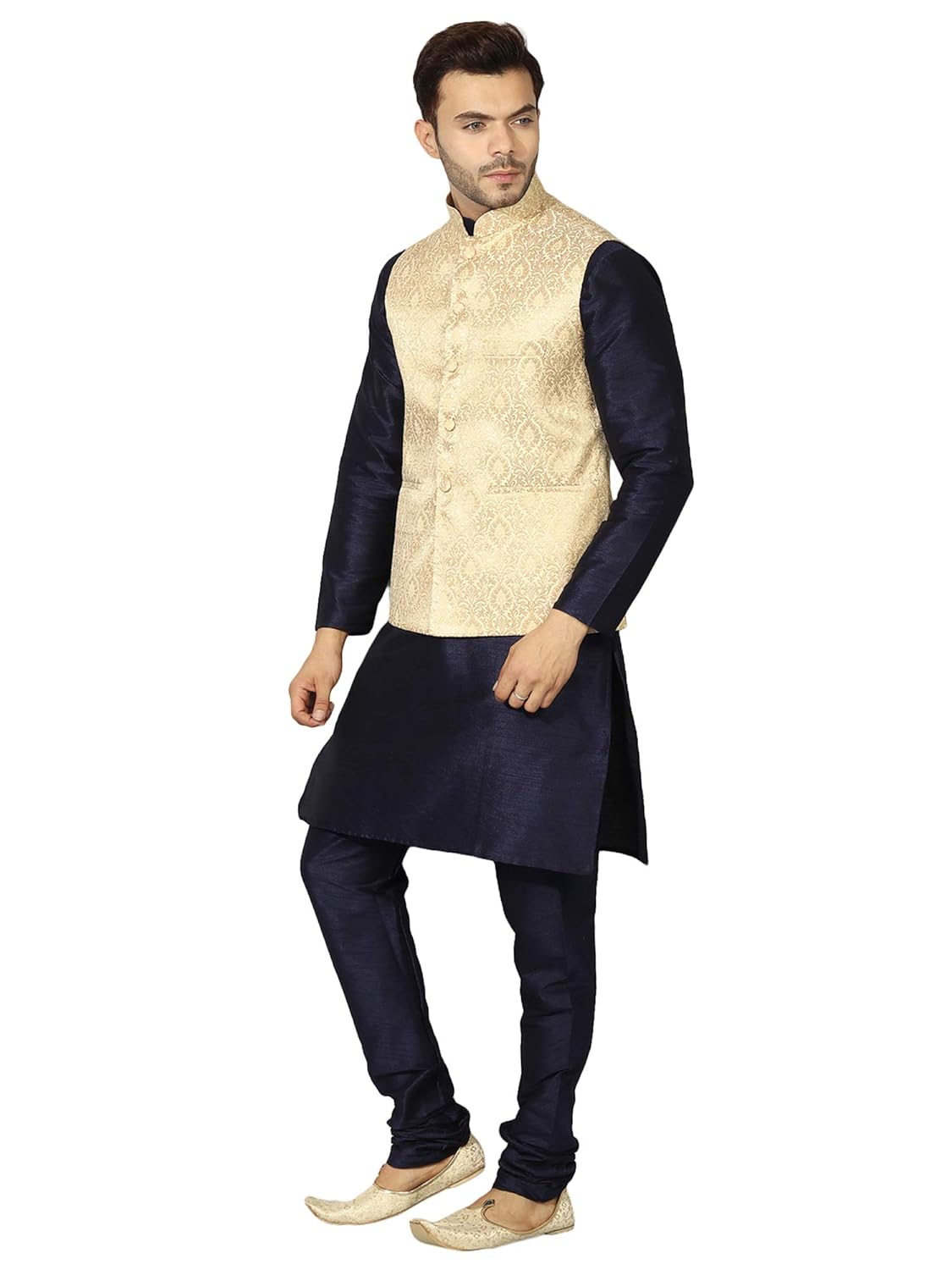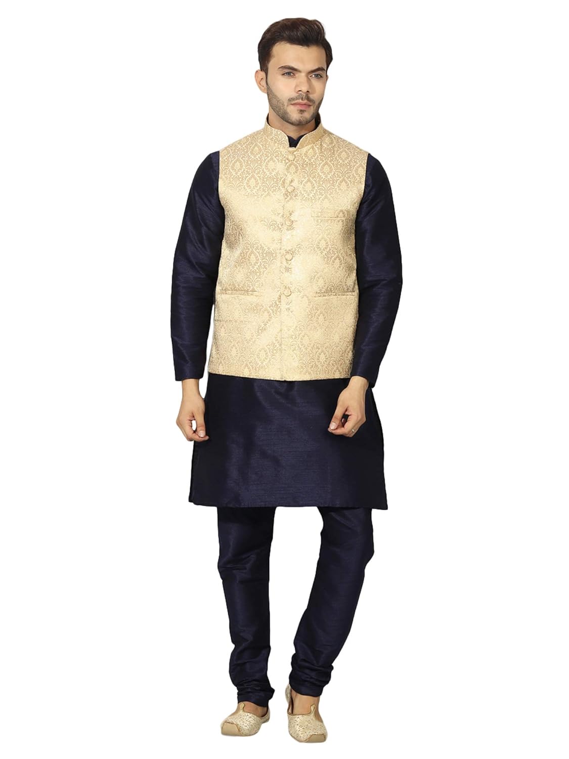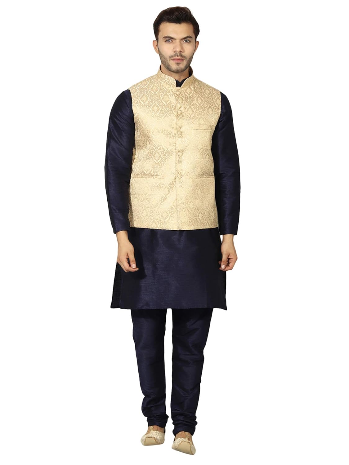 This traditional Indian kurta Pyjama jacket set includes a kurta with bundi Nehru Jacket and a Churidar pyjama. Regular comfortable fitting makes it great wear.