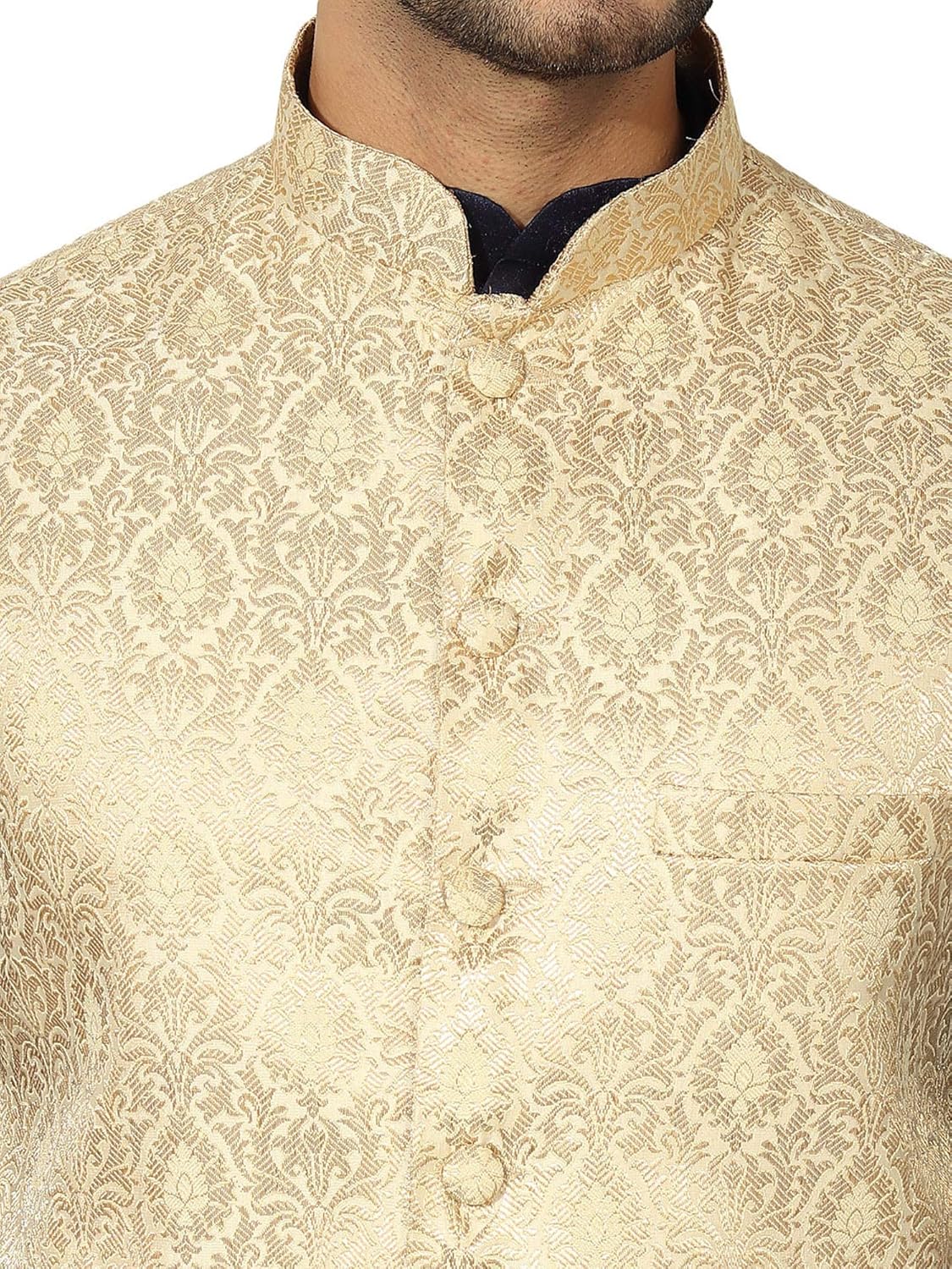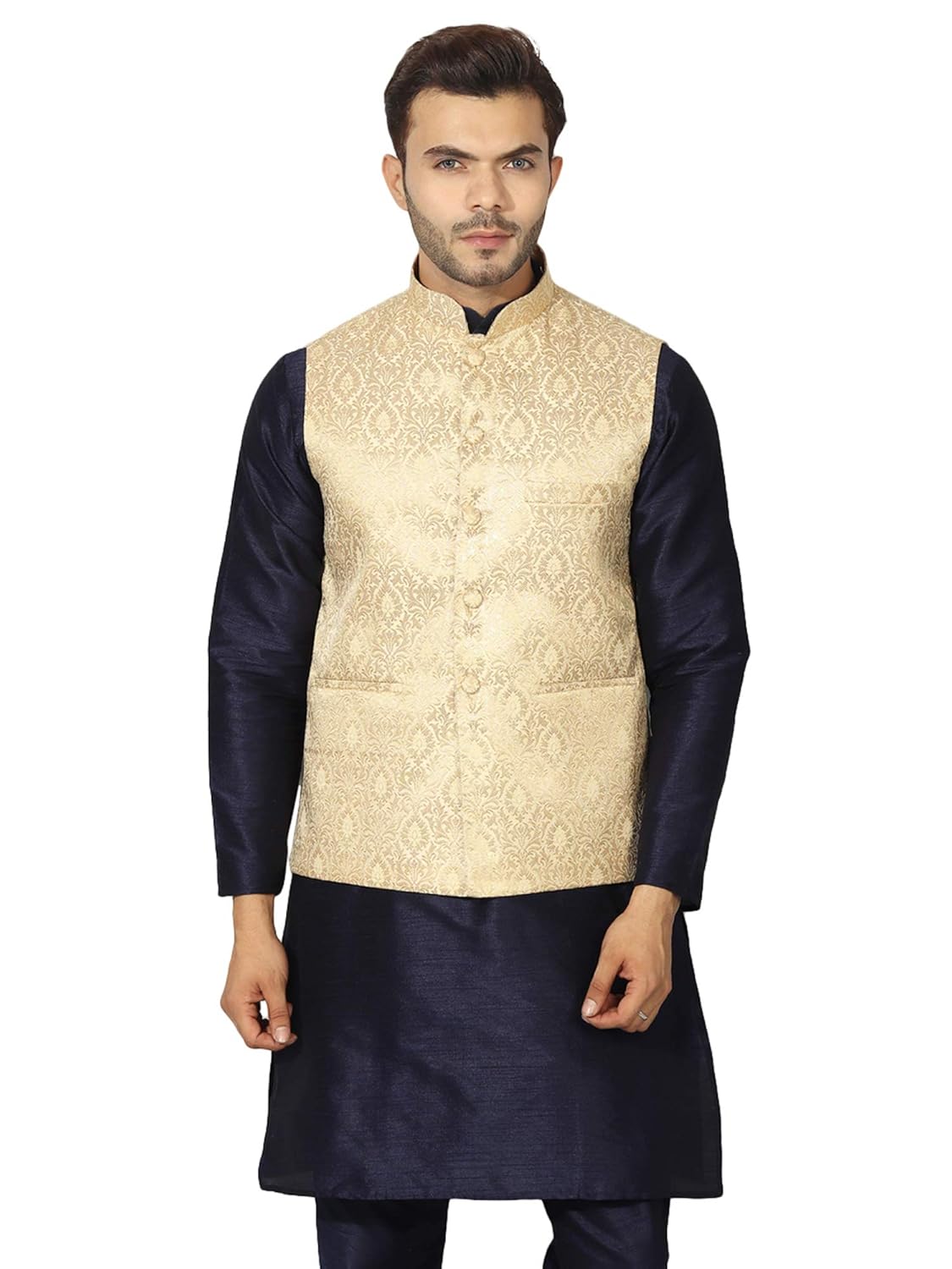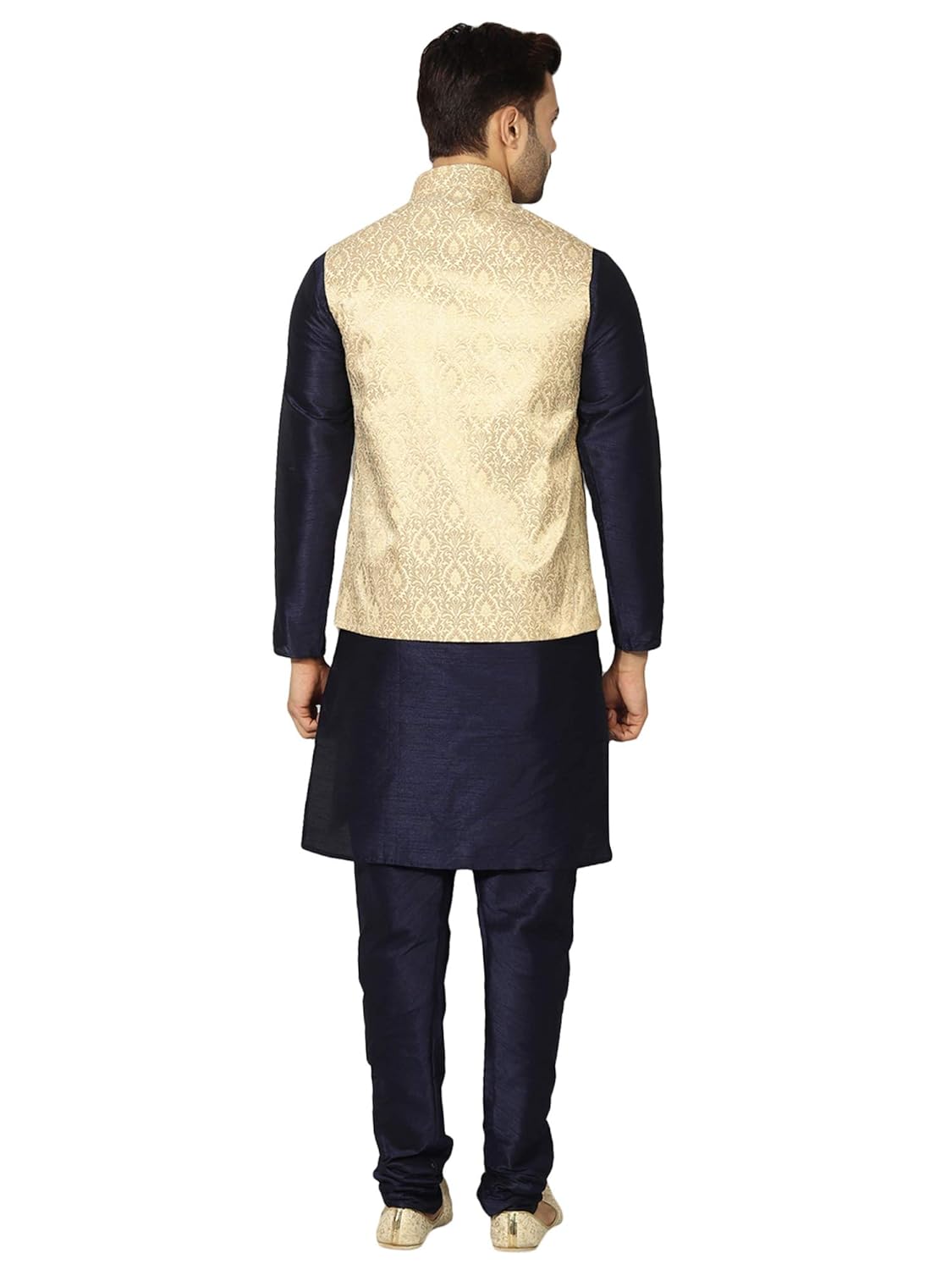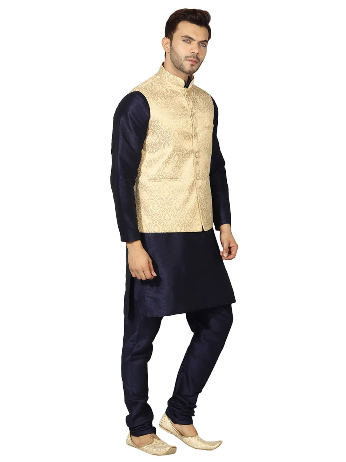 This traditional Indian kurta Pyjama jacket set includes a kurta with bundi Nehru Jacket and a Churidar pyjama. Regular comfortable fitting makes it great wear.