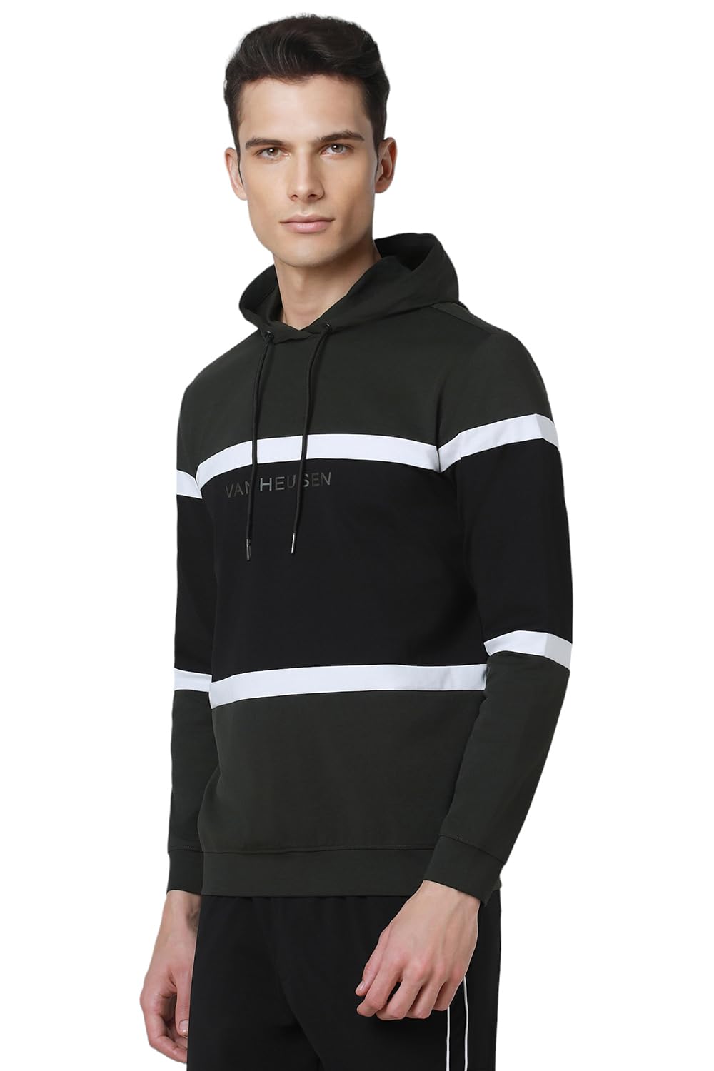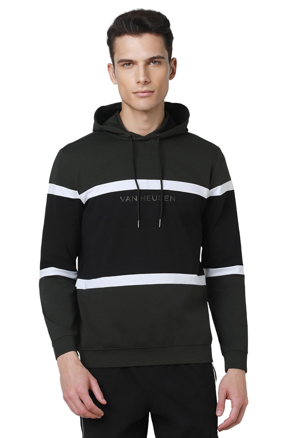 Cozy and comfortable,get this Black Patterned sweatshirt from Van Heusen Flex by Van Heusen for a perfect look.Fashion meets performance for an unmatched style quotient in Active Wear with Easy Dry, Antimicrobial Reflect technologies. Sport an all-new style with Van Heusen Flex. Stay on top of your game on the field and off it.