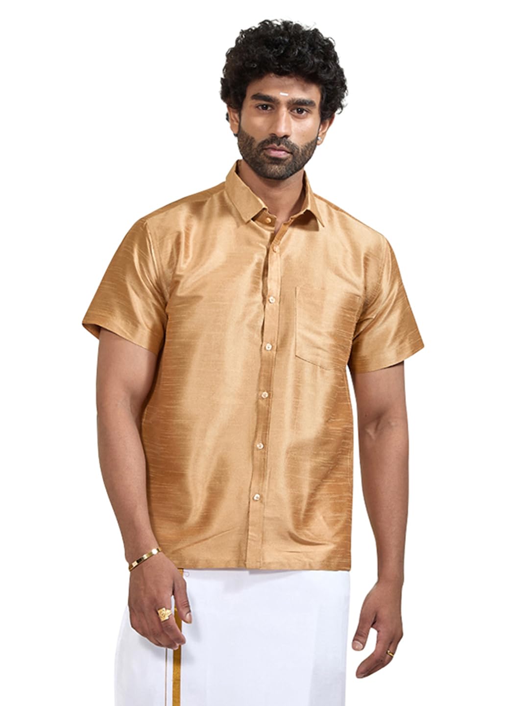 VASTRAMAY Men’s Silk Blend Ethnic Shirt – Half Sleeves, South Indian Traditional Shirt for Weddings, Festivals, & Casual Wear