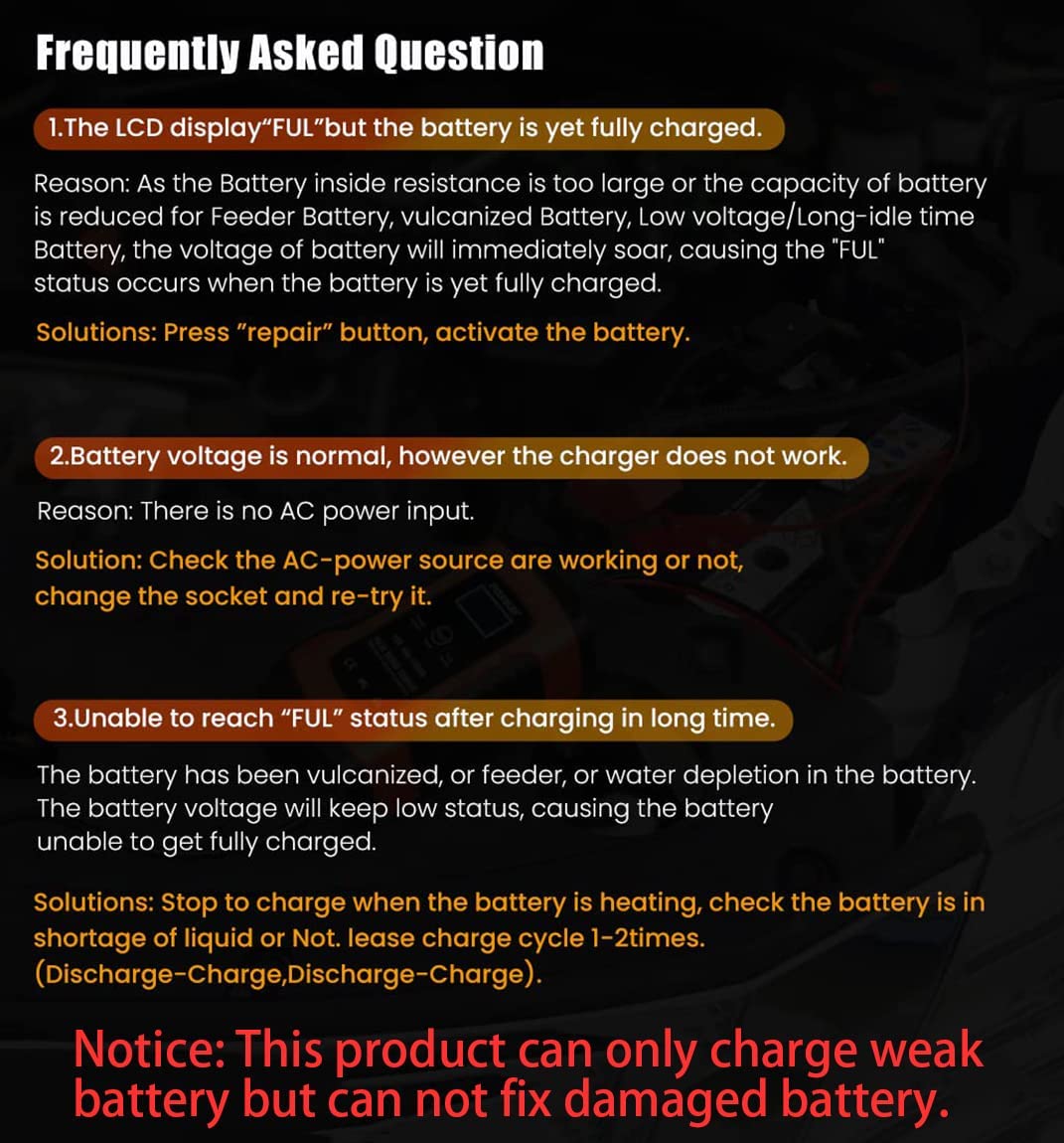 High Technology & Efficiency: Solve battery power, power acceleration and internal resistance problems. Using pulse repair technology to repair pulsed high frequency and low frequency, low bottle piezoelectric, has been idle for a long time, the battery does not charge the battery, has a good effect repair and activation, thus changing the battery is a good measure.