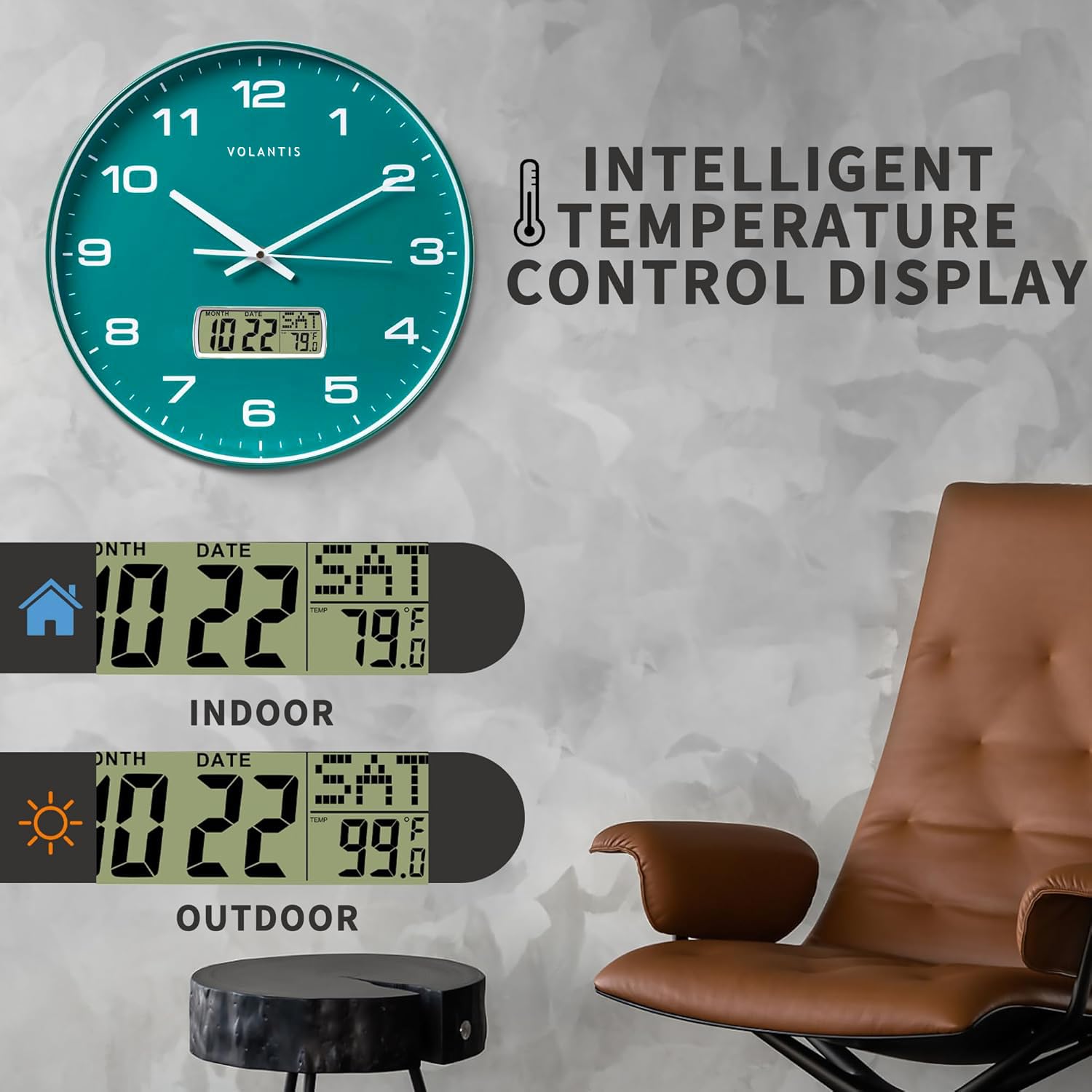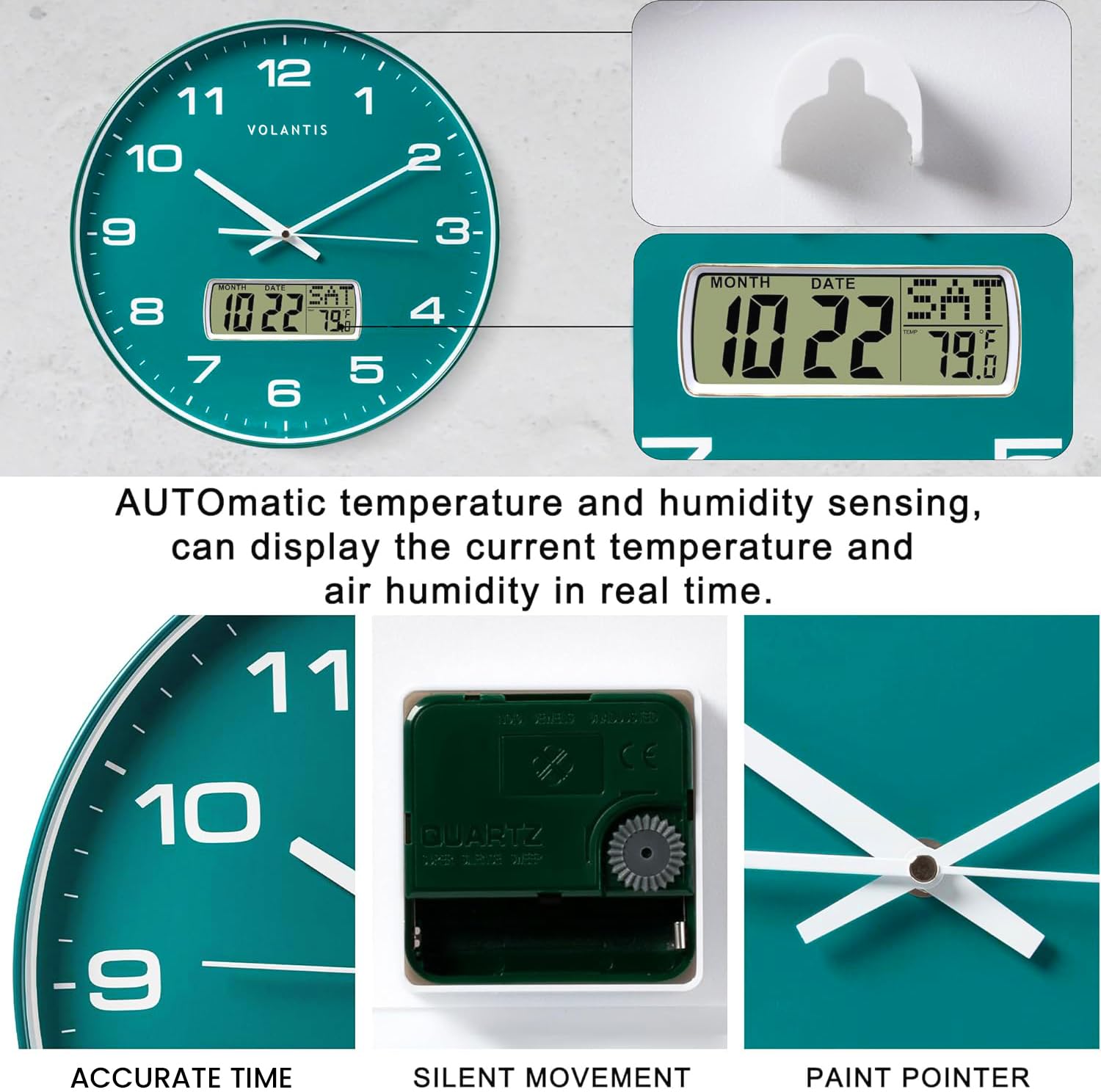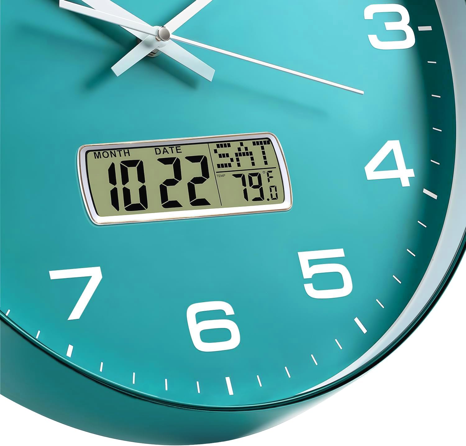 This wall clock is simple and useful. It doesnβt make any ticking noise, so itβs good for quiet rooms. The display shows the date and temperature clearly. The green color looks nice and the clock feels strong. Overall, itβs easy to use and works well.