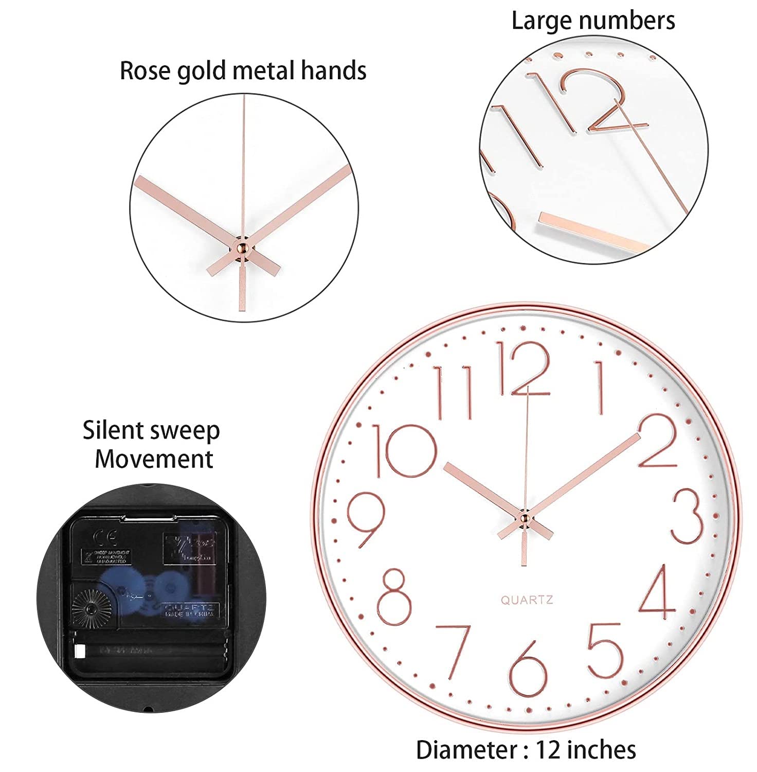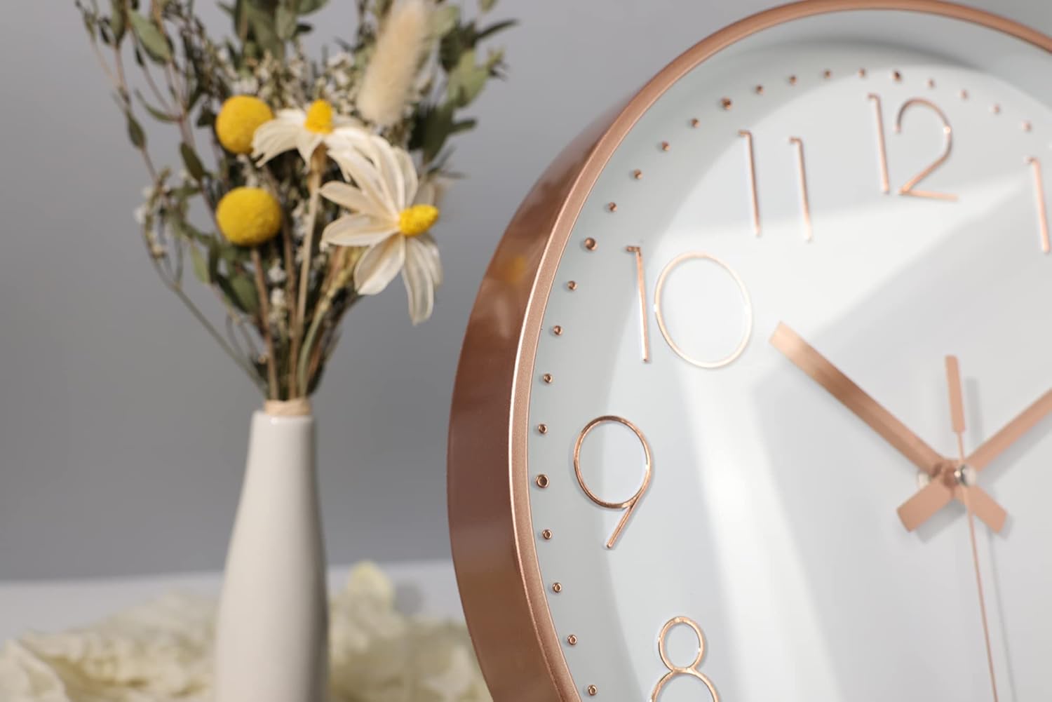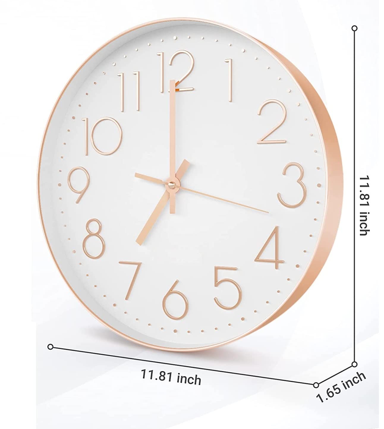 Beautiful wall clock with a classy black and rose gold look. Completely silent, so perfect for bedroom and office. The size is ideal and looks very premium on the wall. Happy with the quality and design.