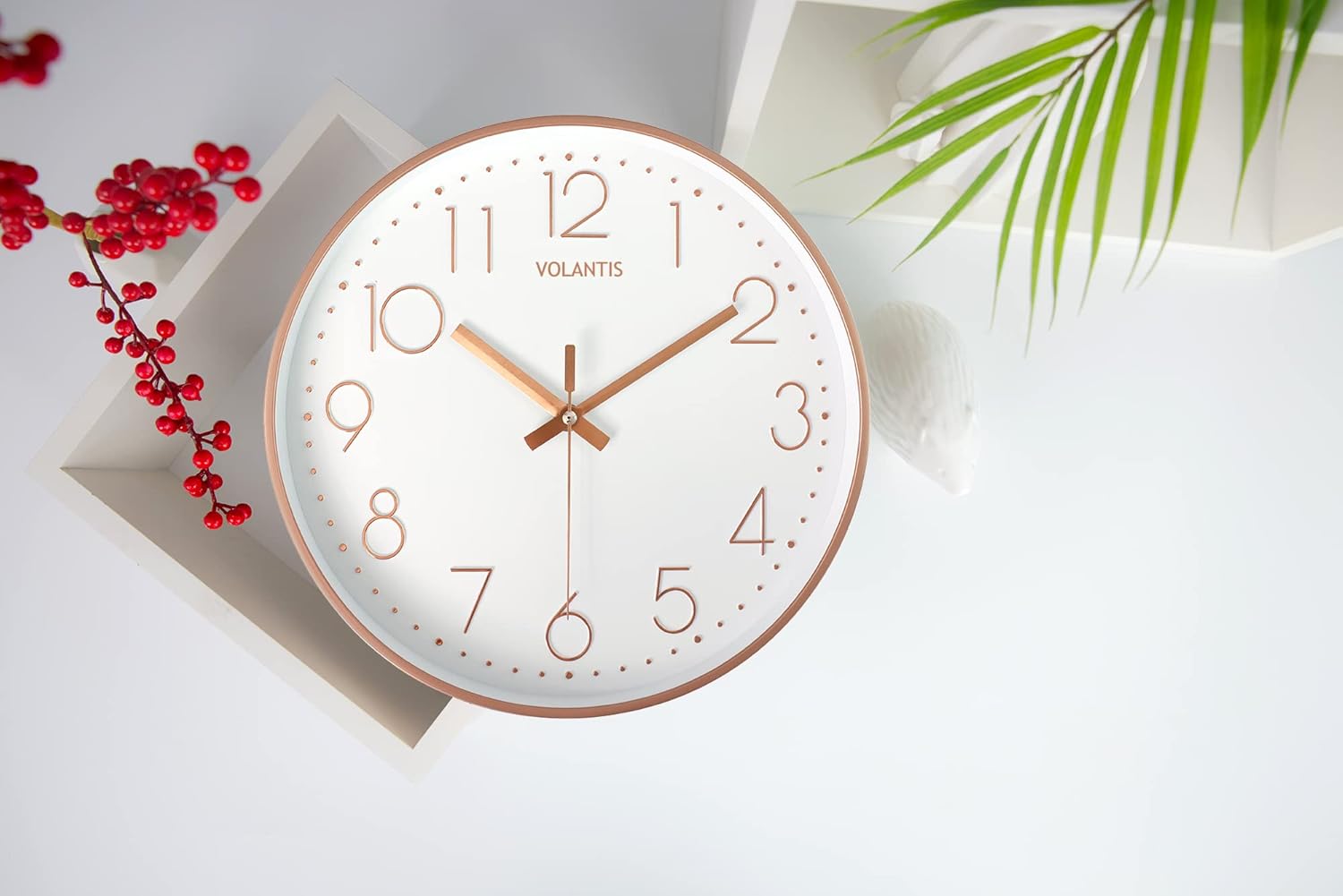VOLANTIS Plastic 12 Inch Modern Stylish Non Ticking Silent Analog Wall Clock For Home, Living Room, Bedroom, Office, And Kitchen (White & Rose Gold)
