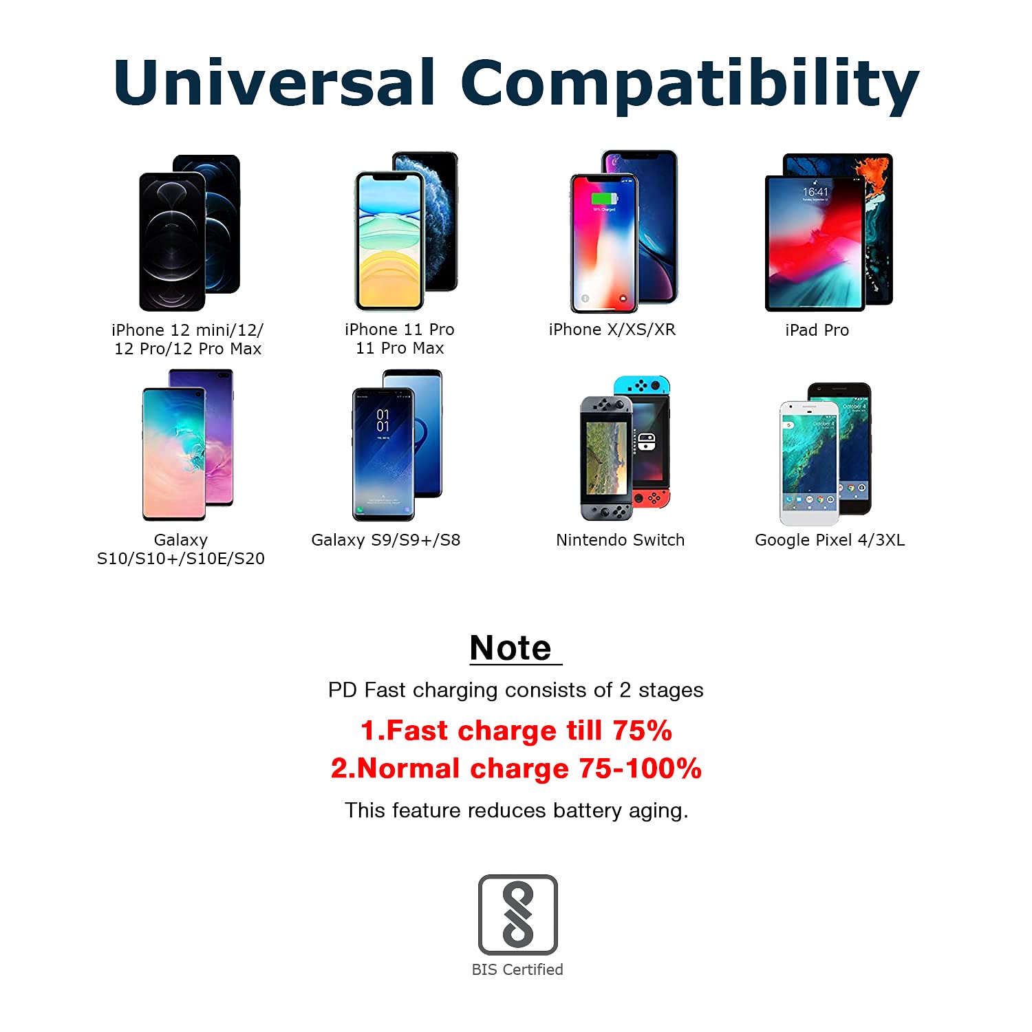 USB C Output 5V/3A, 9V/2A-2.22A, 12V/1.5A-1.67A, 3.3-5.9V/3A, 3.3-11V/1.63A-1.8A Fast Charging Protocols PD 3.0/2.0, QC 3.0/2.0, 5V1A PD Charger Charging new iPhone form 0 to 50% in just 30 mins Multiple Protections BIS Certified, Protected from Over voltage, Over current, short circuit, Over temperature, etc. Input 100-240V, 50/60Hz Compatible For iPhone 12/12 Mini/12 Pro/12 Pro Max, iPhone SE, iPhone 11/11 Pro/11 Pro Max, iPhone XR/ X/Xs/XS Max, iPhone 8Plus/8, ect Compatible For iPad Pro 11”/12.9″ 2018 , iPad Pro 10.5”, iPad Air 3, iPad mini 5 7.9″, ect Compatible For Samsung Galaxy S21 Ultra S20 S10 S10e S10+ S9 S8, Note 9 8, ect Compatible For Google Pixel 4a, 4XL, 4, 3a XL, 3a, 3 XL, 3, 2 XL, ect Compatible For Nintendo Switch, ect
