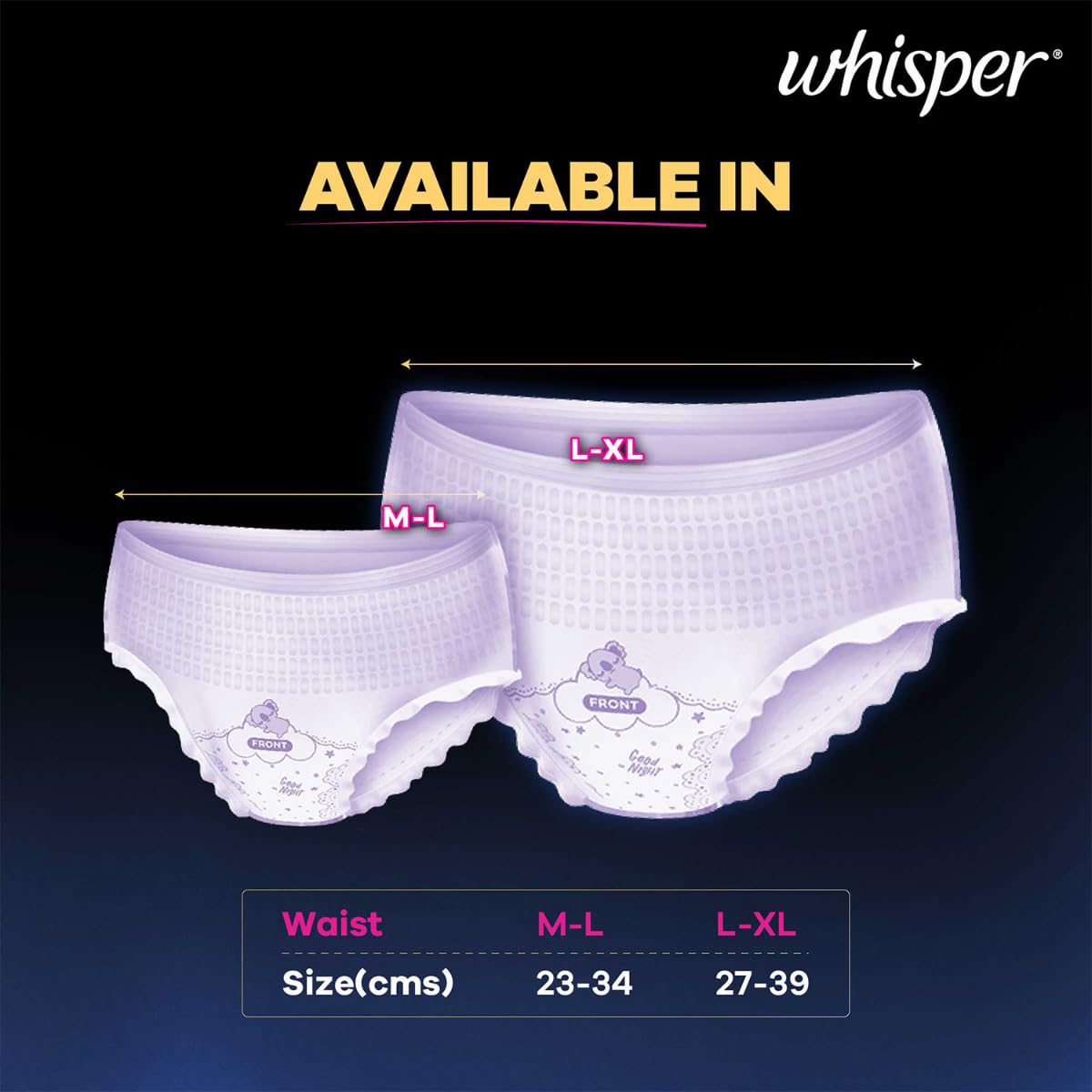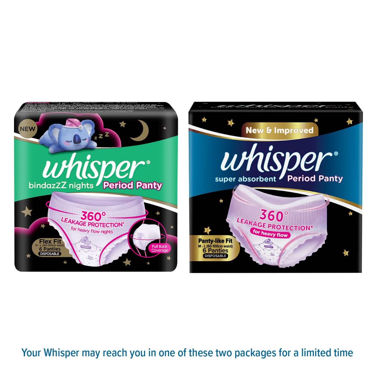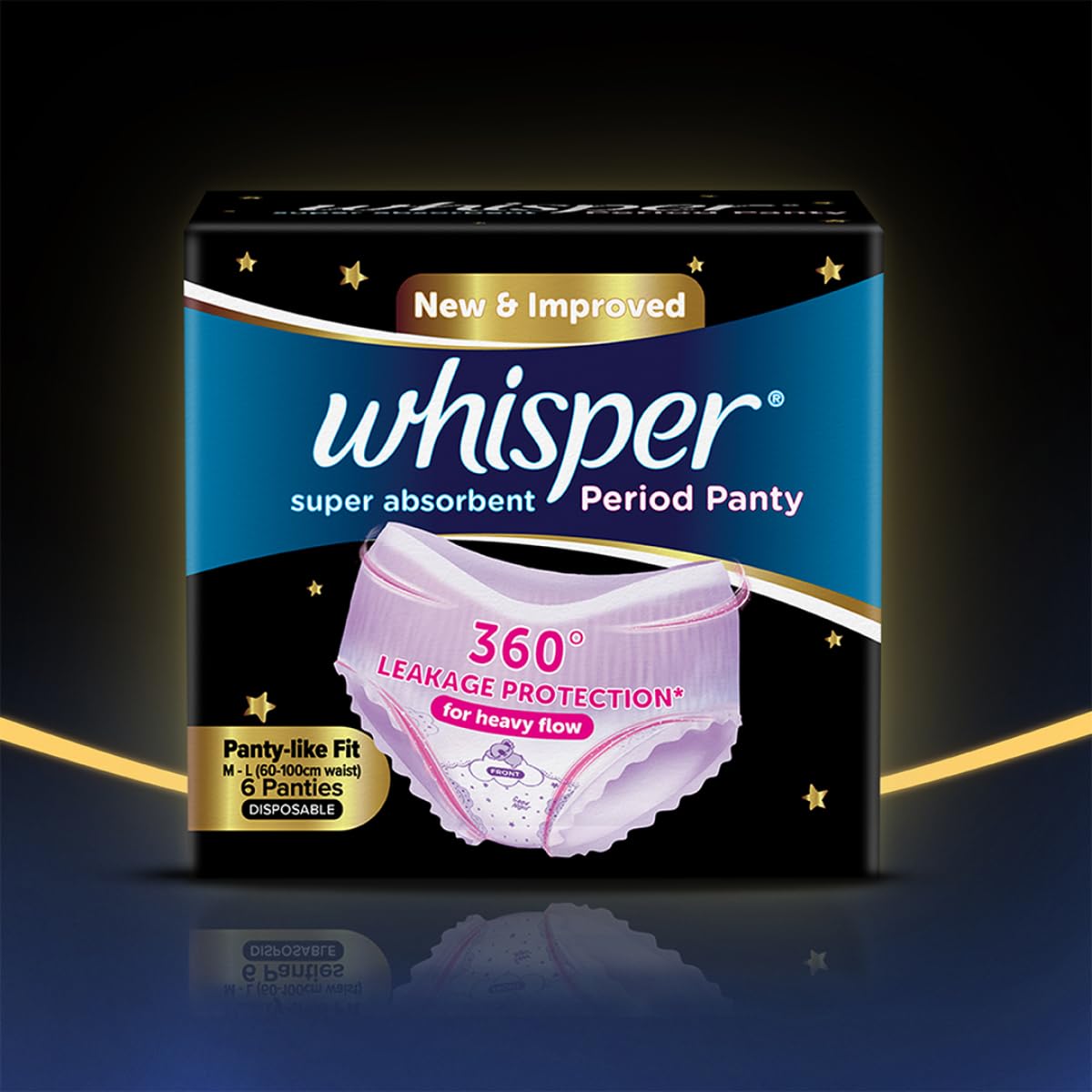 Whisper Super Absorbent Period Panty, 6 M-L Pants, 360 Degree Leakage Protection for Heavy Flow, Panty like Fit for Full back Coverage, Absorbs Heavy Gushes, Silky Soft, Comfortable Feel