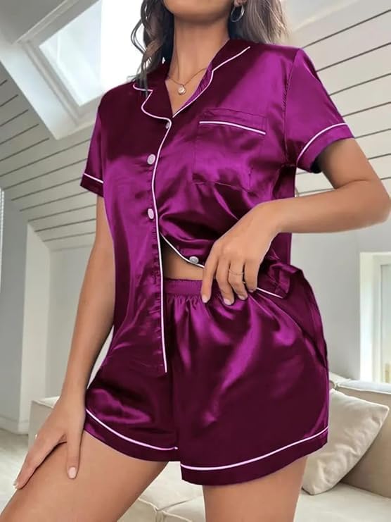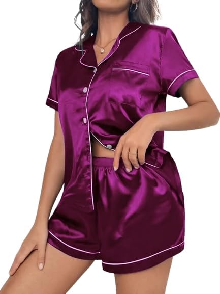 Women’s Satin Plain/Solid Relaxed Night Suit Set of Top Shorts Pajama Set Button-Down Silk Pajamas Floral Sleepwear Bridal Pjs Lounge Pj Sets (l, Purple)