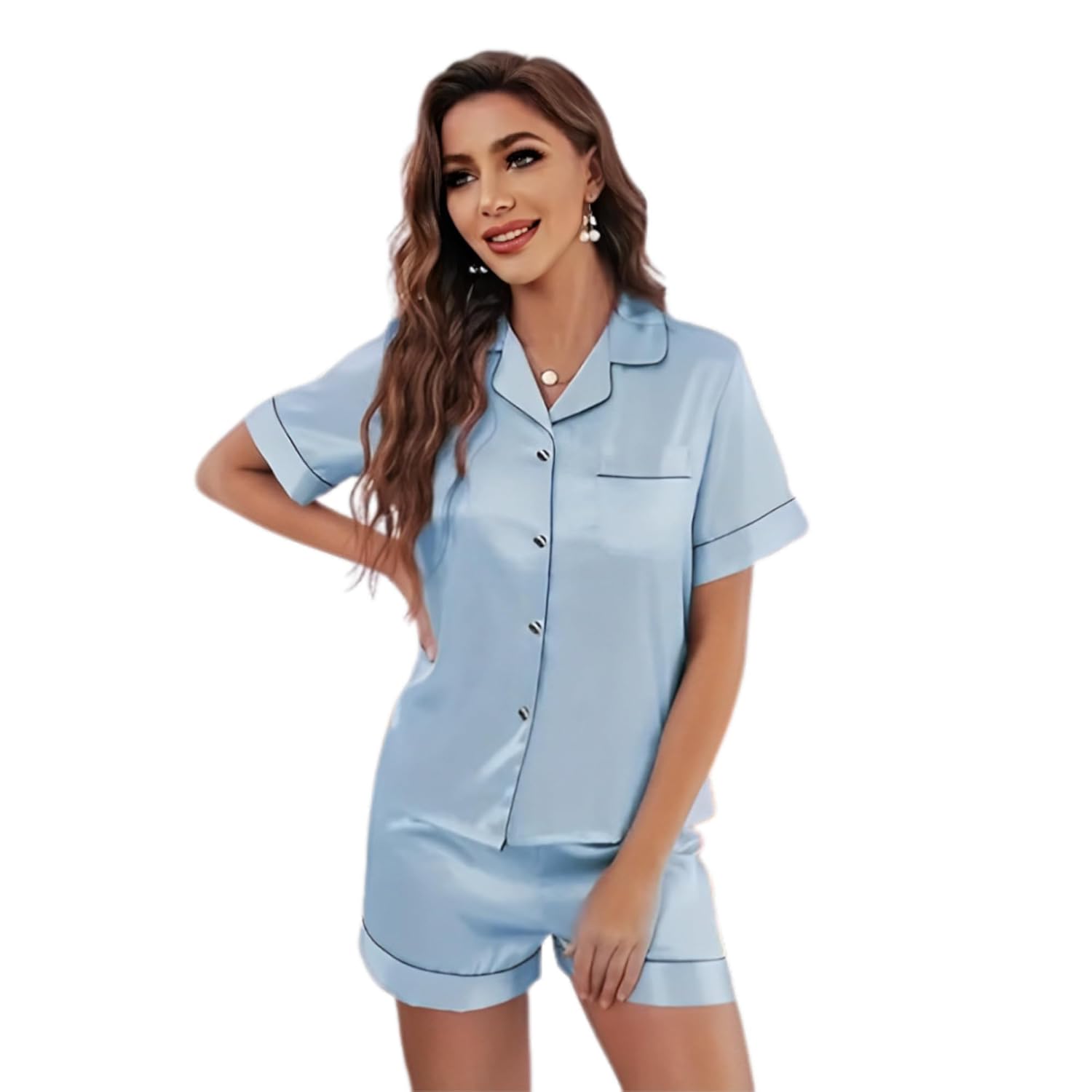 Women’s Satin Plain/Solid Relaxed Night Suit Set of Top & Shorts Pajama Set Button-Down Silk Pajamas Floral Sleepwear Bridal Pjs Lounge Pj Sets (Small, Sky Blue)
