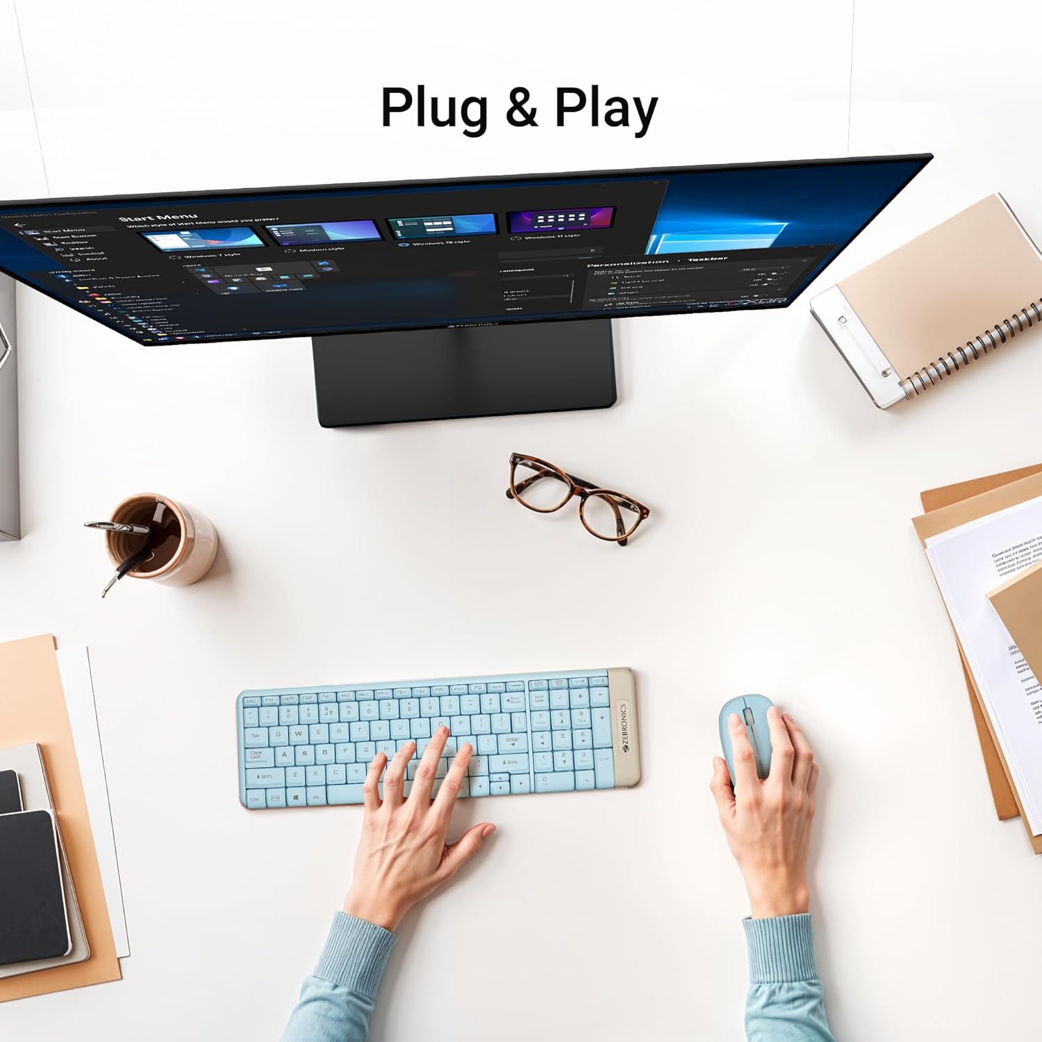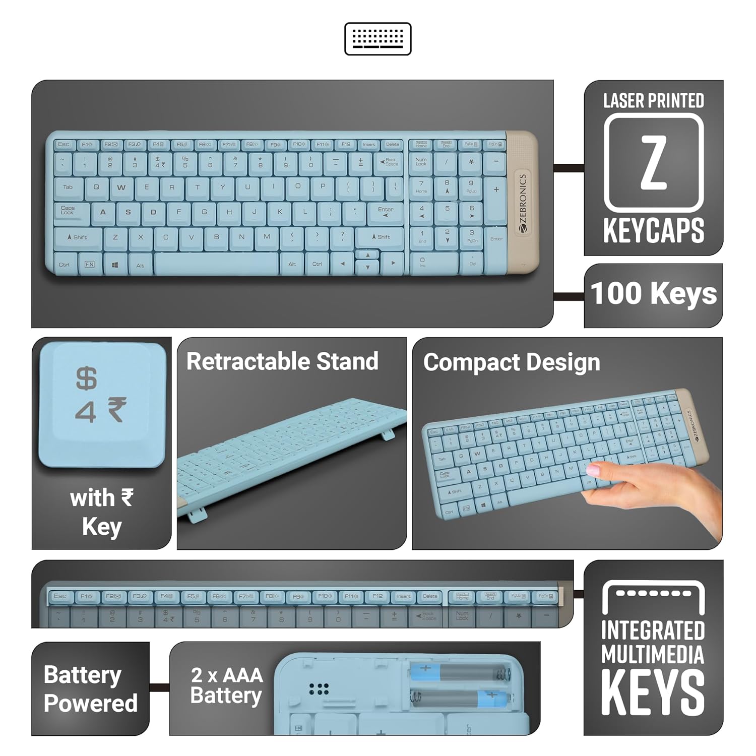 8 reviews for ZEBRONICS Companion 104 2.4GHz Wireless Keyboard & Mouse Combo, 100 Keys, Laser Printed Keycaps, Integrated Multimedia Keys, 3 Button Mouse, 1200 DPI, High Precision, Advanced Optical Sensor (Blue)