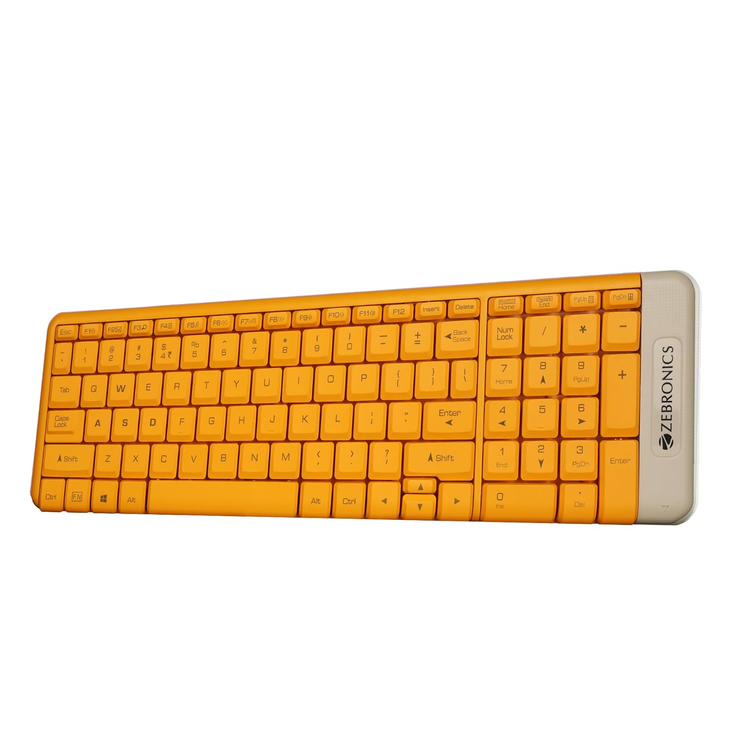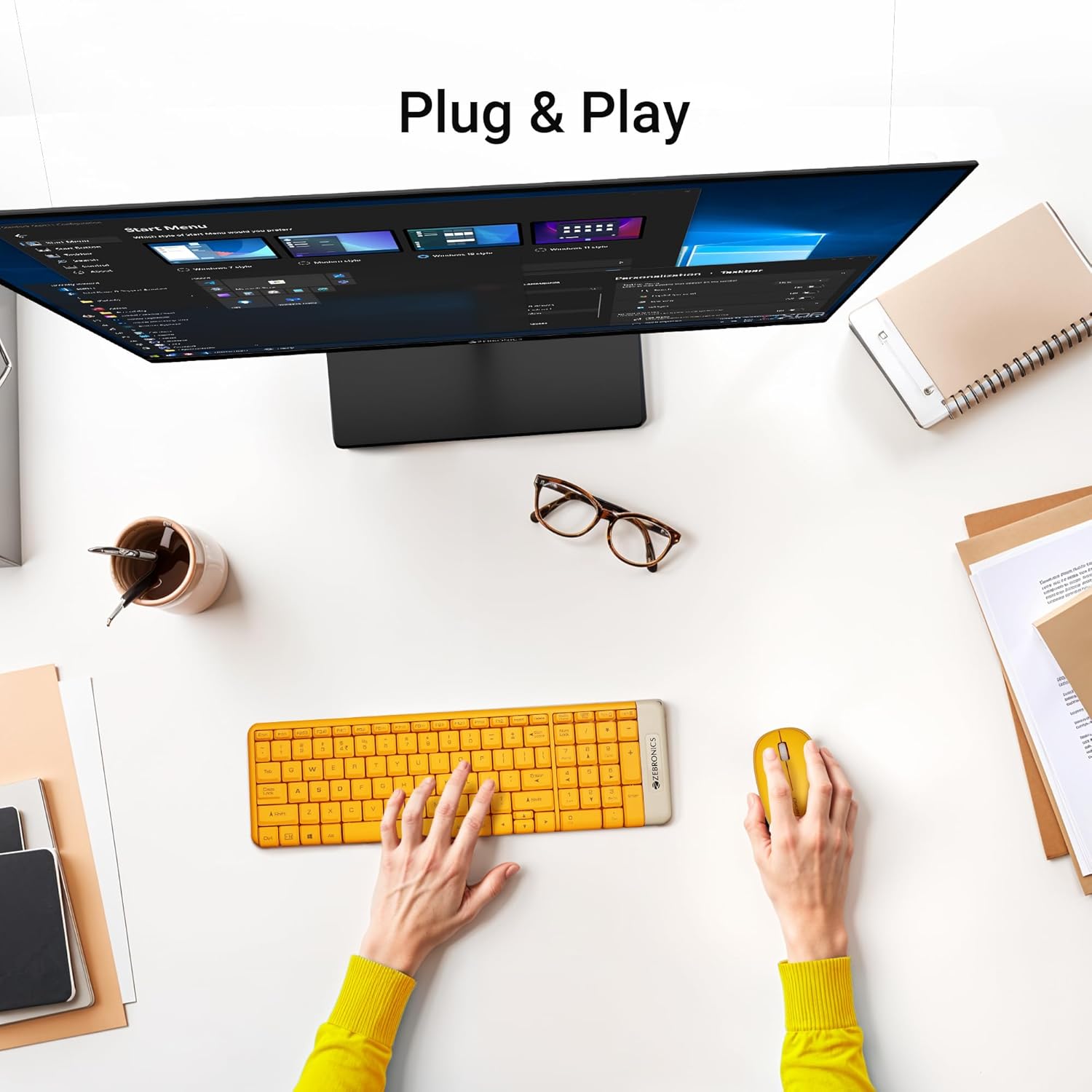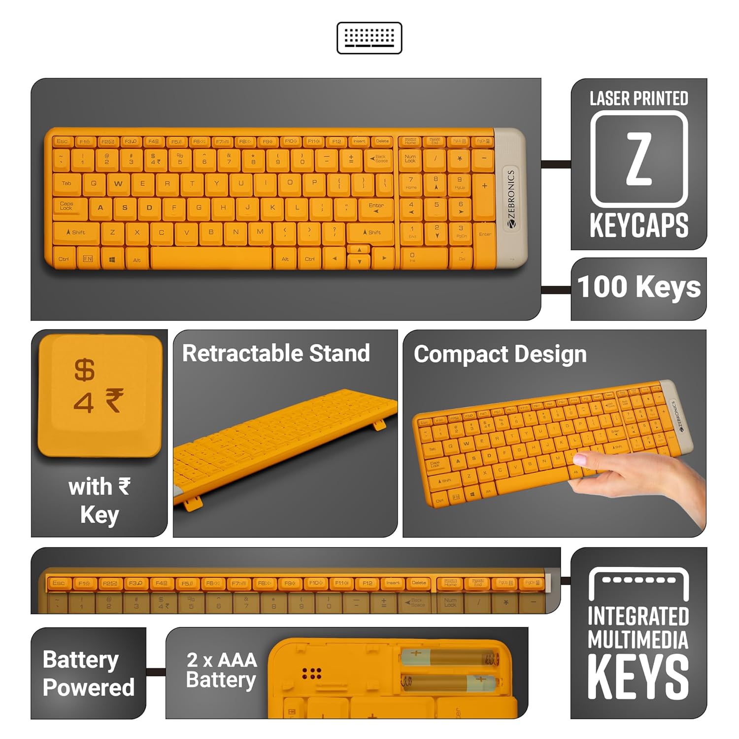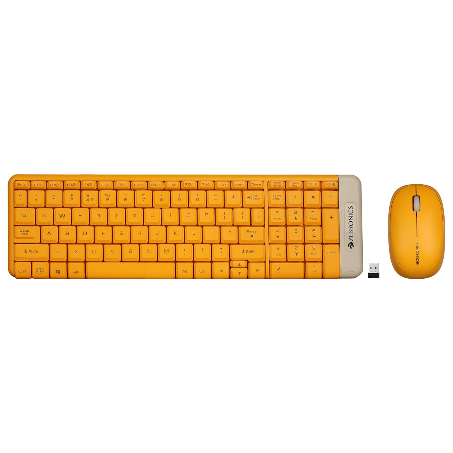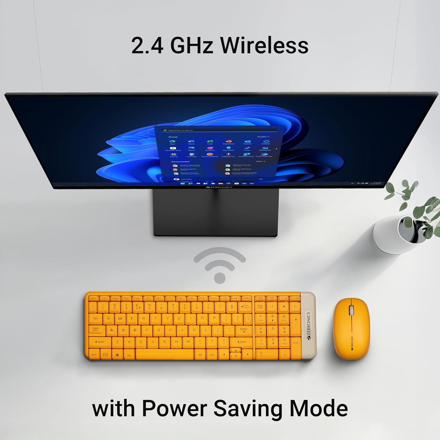 ZEBRONICS Companion 104 2.4GHz Wireless Keyboard & Mouse Combo, 100 Keys, Laser Printed Keycaps, Integrated Multimedia Keys, 3 Button Mouse, 1200 DPI, High Precision, Advanced Optical Sensor (Yellow)