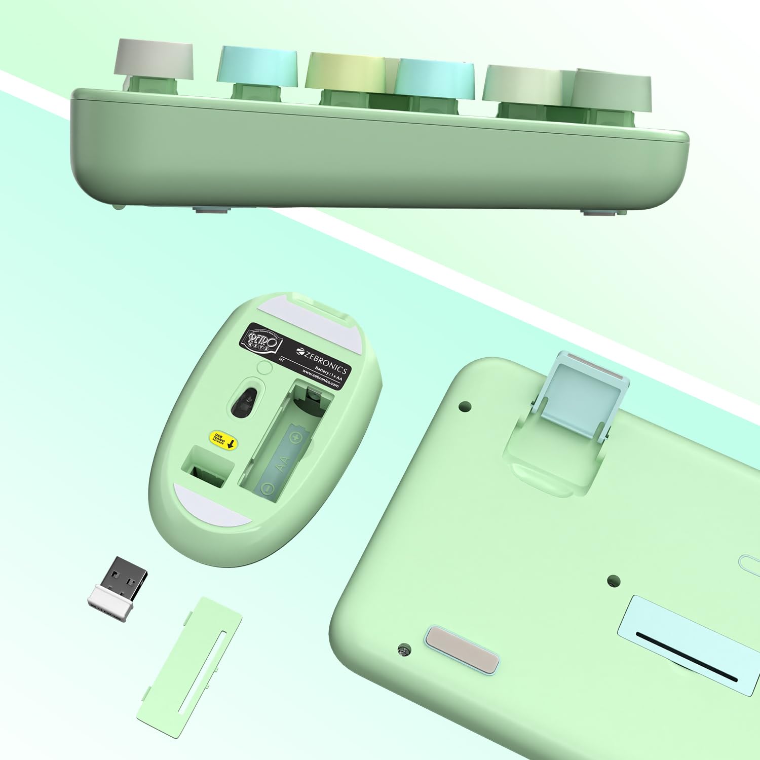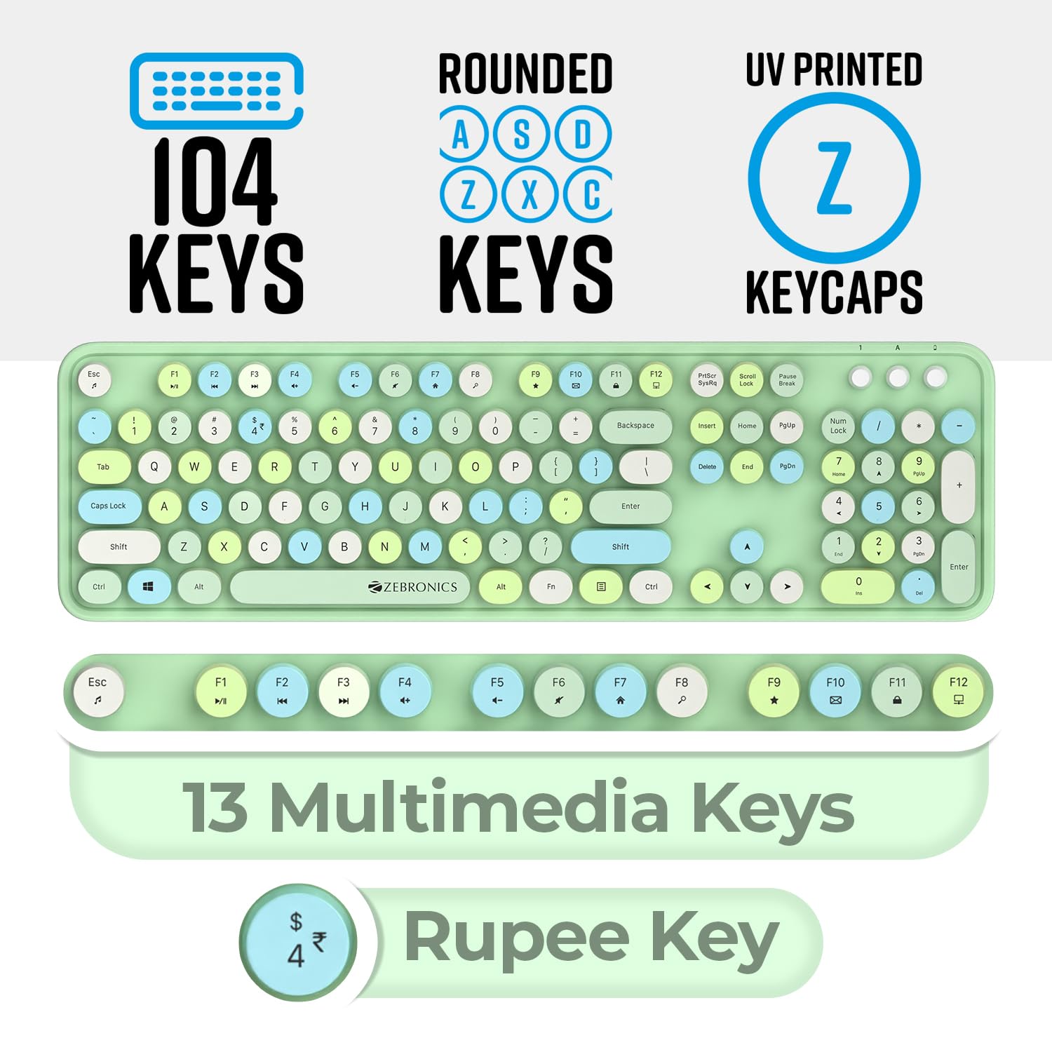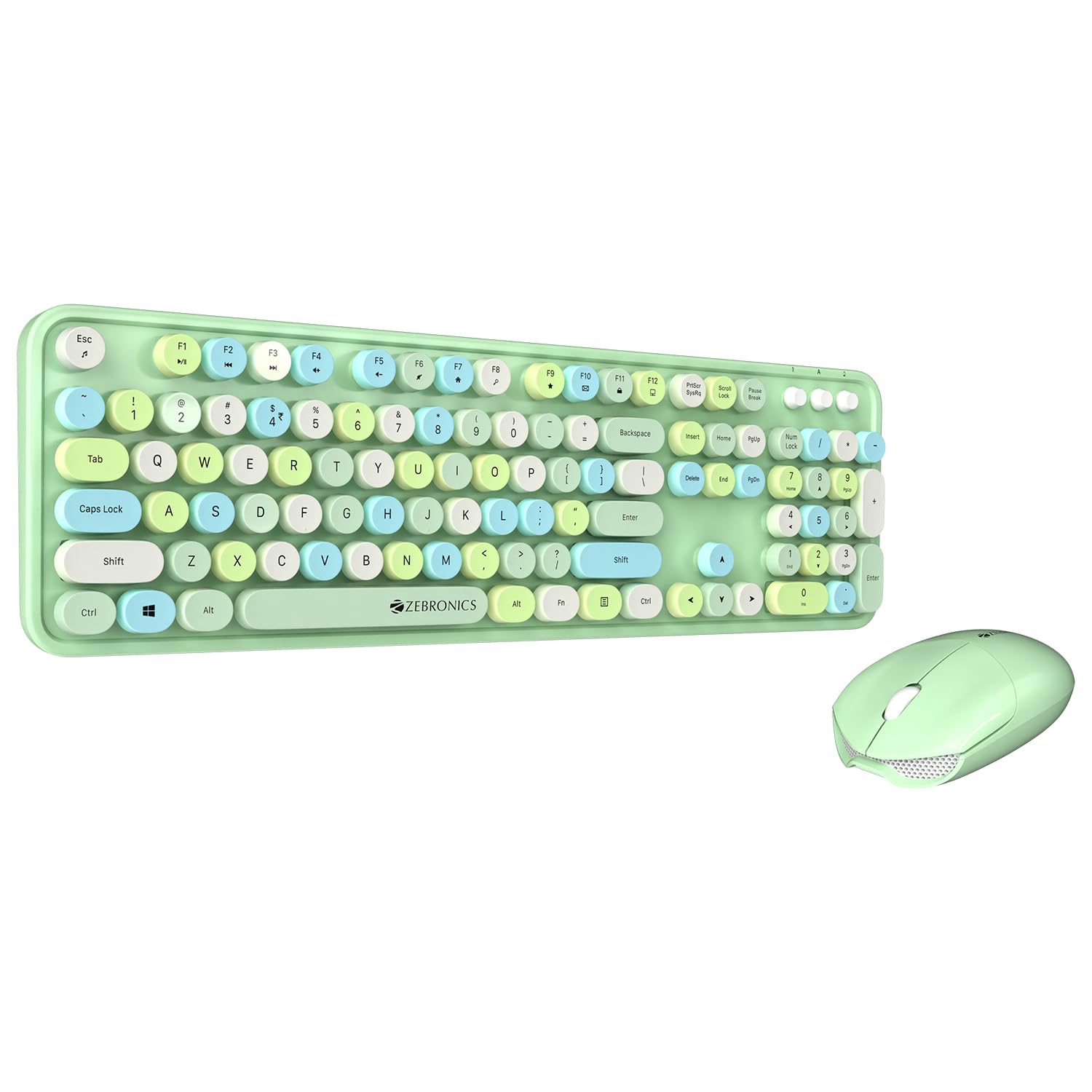 ZEBRONICS Companion 300 2.4GHz Wireless Keyboard & Mouse Combo with UV Printed, Retro Style Keys, 104 + 13 Integrated Multimedia Keys,1600 DPI, High Precision (Green)