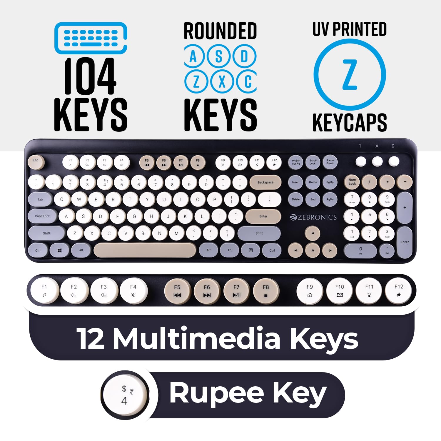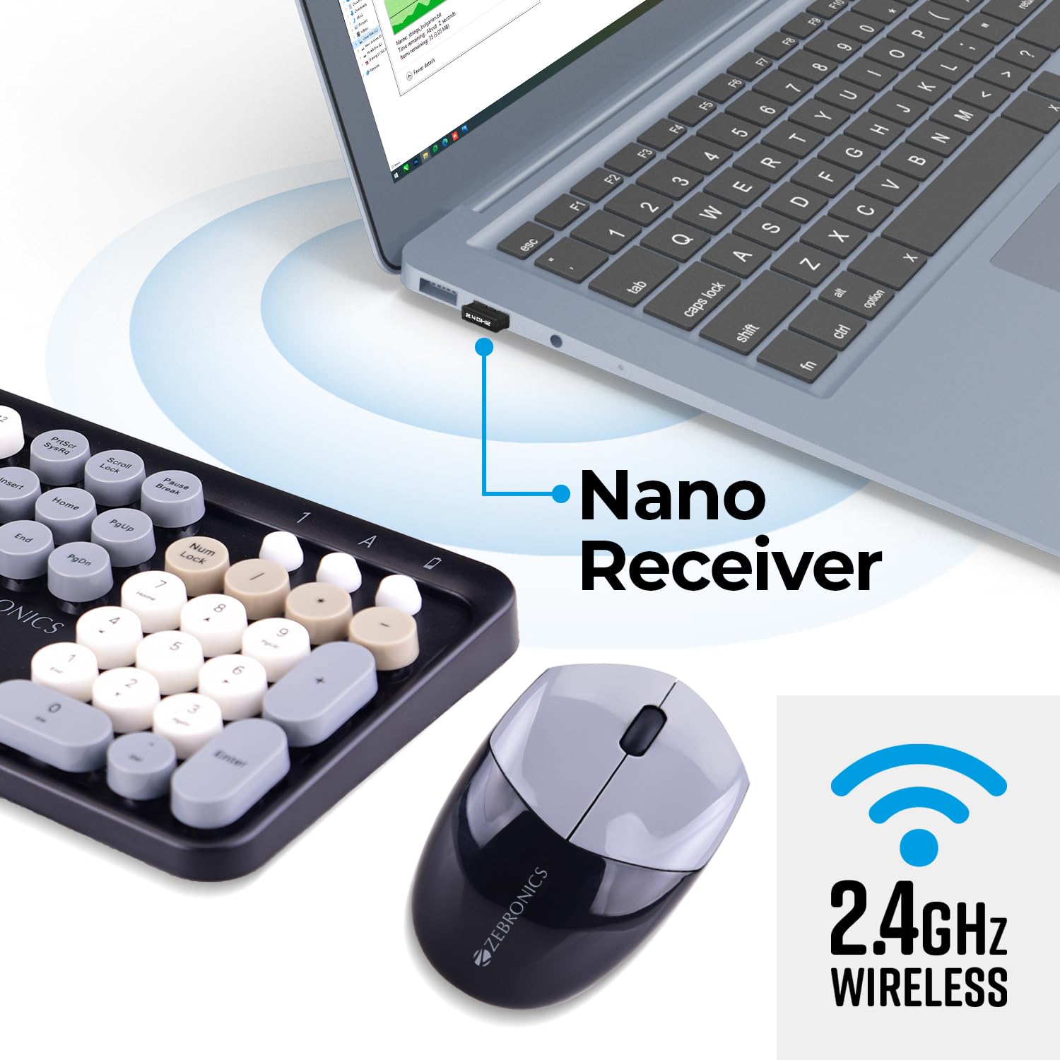 ZEBRONICS Companion 301 2.4GHz Wireless Keyboard & Mouse Combo with UV Printed, Retro Style Keys, 104 + 12 Integrated Multimedia Keys, 1600 DPI, High Precision (Black + Grey)