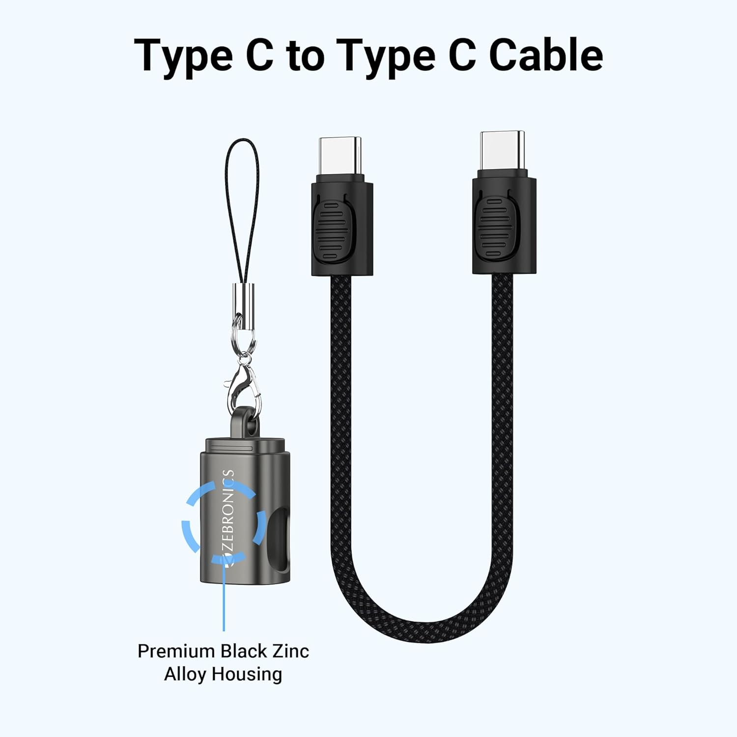 Zebronics Wattz 60CC4 Type-C to Type-C Braided Cable, PD 60W, 20 cm, Durable, Charge & Sync, Rapid Charging, Compact with Keychain Case, For Laptops, Tablets, Mobiles (Black)