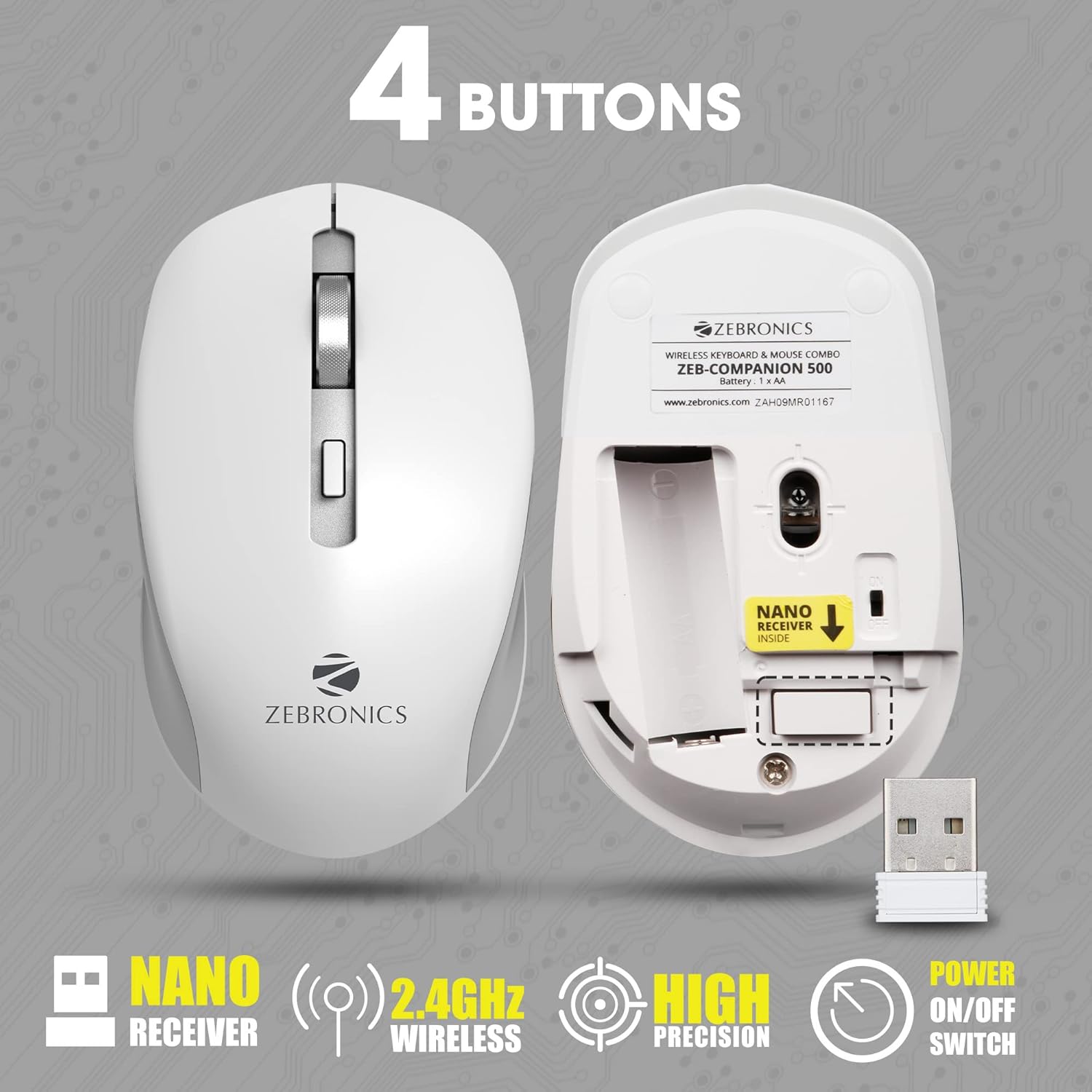 ZEBRONICS Zeb-Companion 500 2.4GHz Wireless Keyboard and Mouse Set, USB Nano Receiver, Chiclet Keys, Ultra Silent, Power On/Off Switch, Rupee Key, for PC/Mac/Laptop (White)